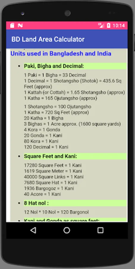 5. Units conversion including decimal, shotok, bigha, biswa, biswansi, guntha, kanal, kani, katha and more.