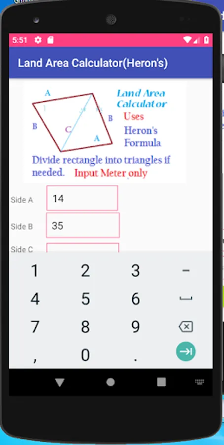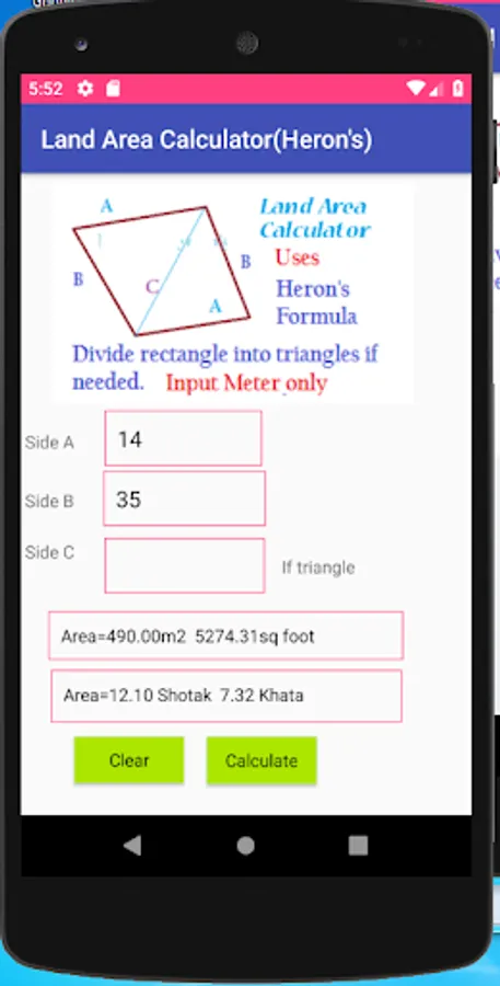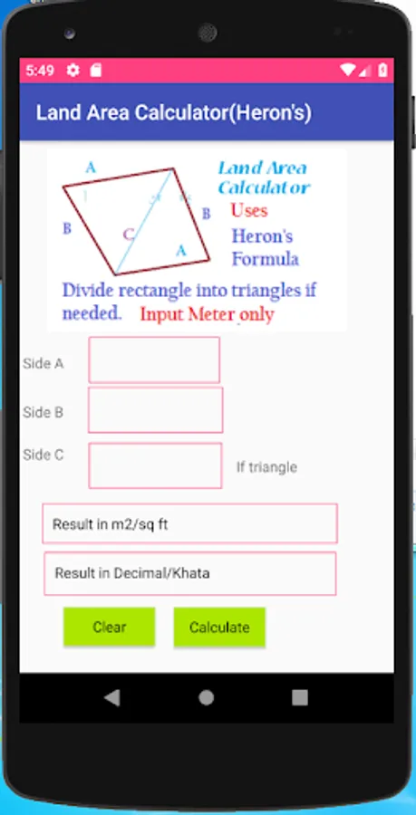This app will calculate land area in square feet, square meter, Decimal and in Katha using well known Heron's formula.