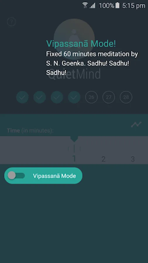 Meditation timer for silent meditation, with option for Vipassana 60-minute sit by S.N. Goenka.