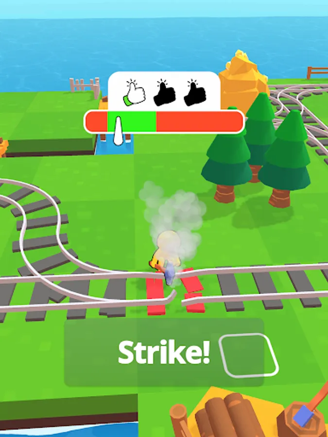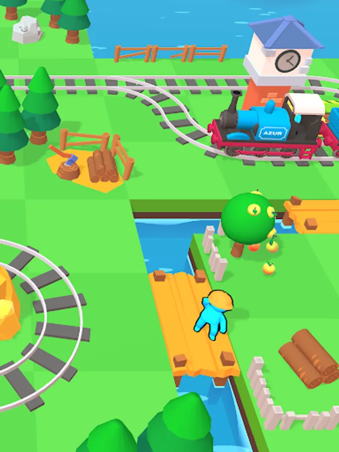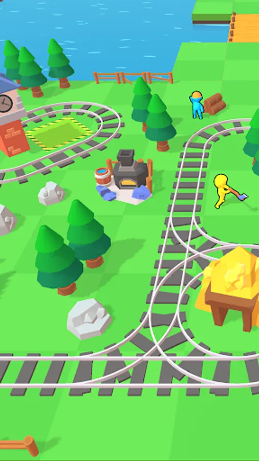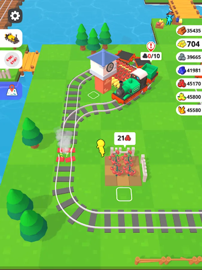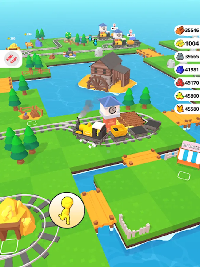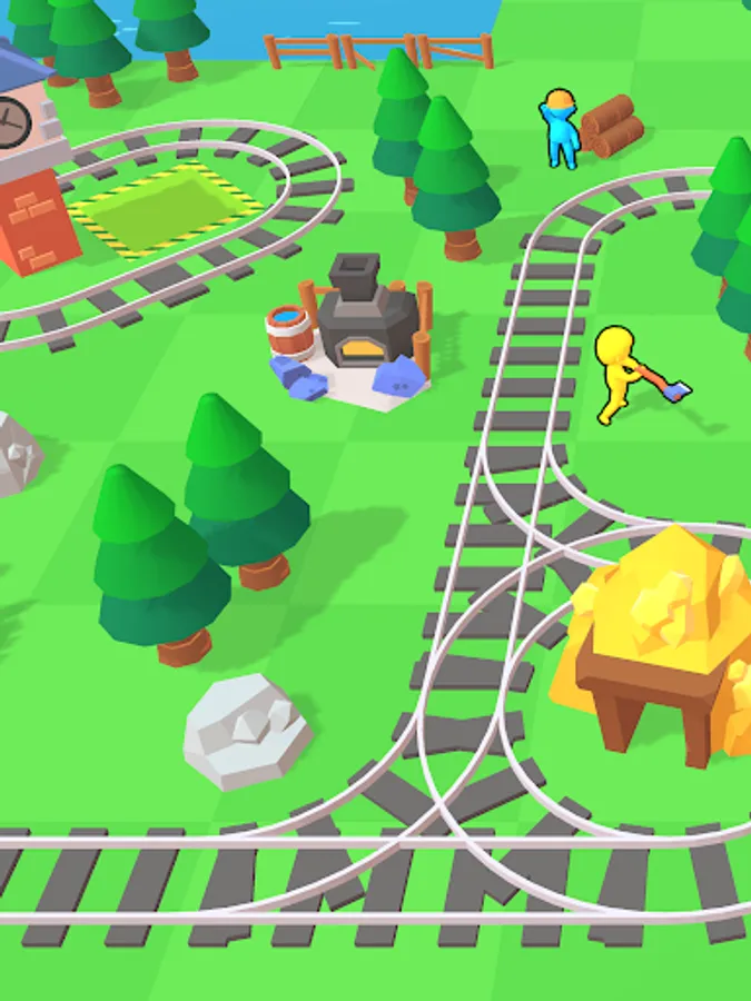 Get gold and stones, chop trees, send your idle train from the platform and expand your lands!