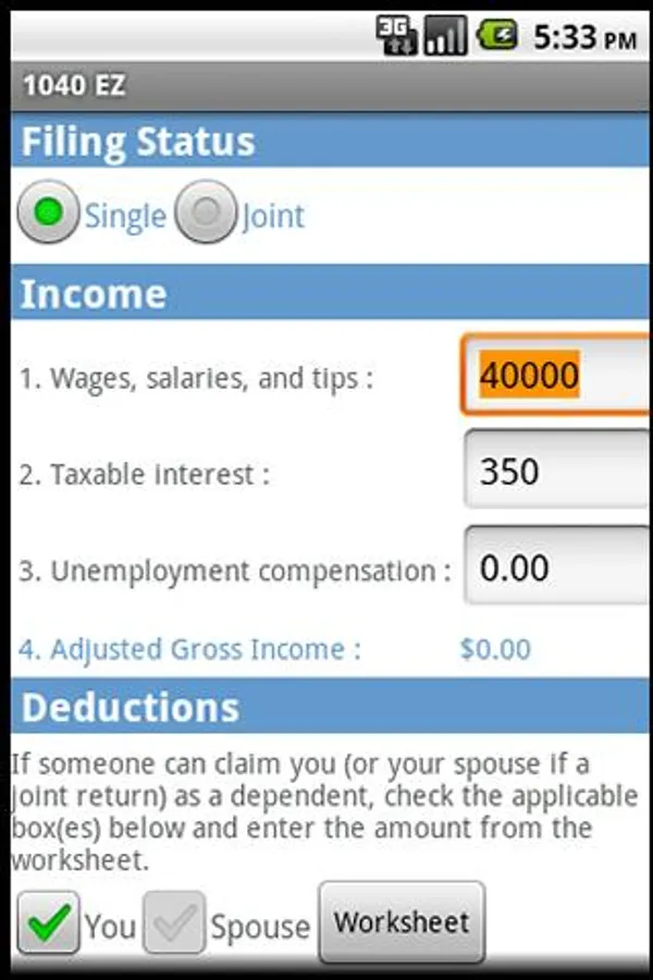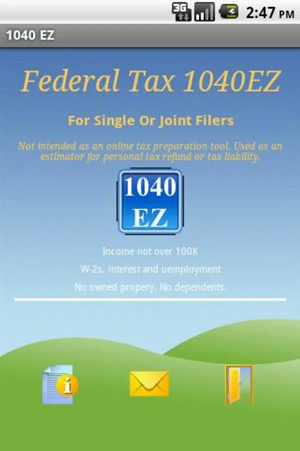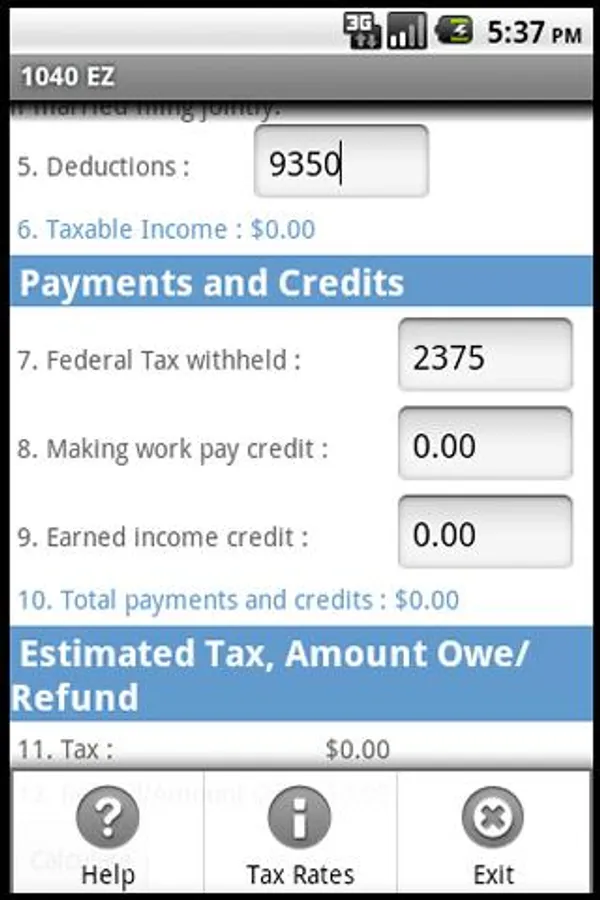FREE! NO PERSONAL INFORMATION REQUIRED! ENTER ONLY DOLLAR AMOUNTS! Do your Federal tax 1040EZ on your device and estimate your Refund or Amount Owe. This app does not file your 1040EZ and should only be used for estimation purposes ONLY