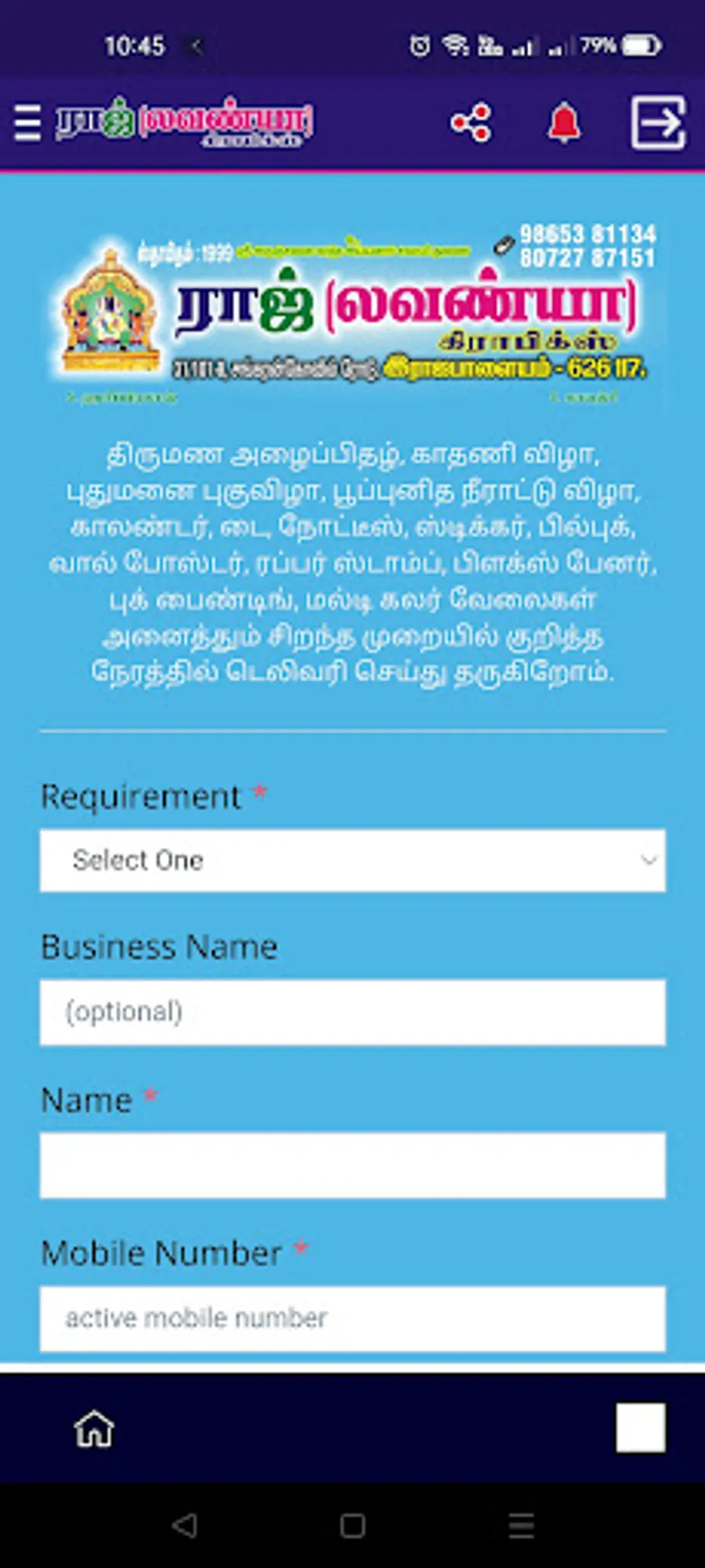 திருமண அழைப்பிதழ், காதணி விழா, புதுமனை புகுவிழா, பூப்புனித நீராட்டு விழா, காலண்டர், டை, நோட்டீஸ், ஸ்டிக்கர், பில்புக், வால் போஸ்டர், ரப்பர் ஸ்டாம்ப், பிளக்ஸ் பேனர், புக் பைண்டிங், மல்டி கலர் வேலைகள் அனைத்தும் சிறந்த முறையில் குறித்த நேரத்தில் டெலிவரி செய்து தருகிறோம்.