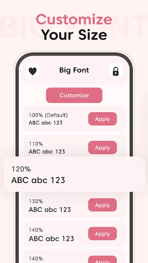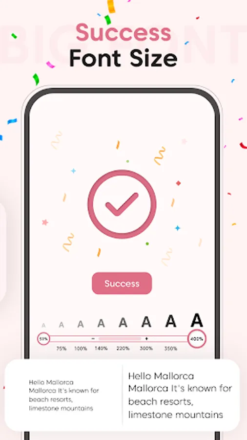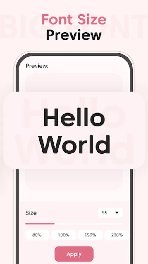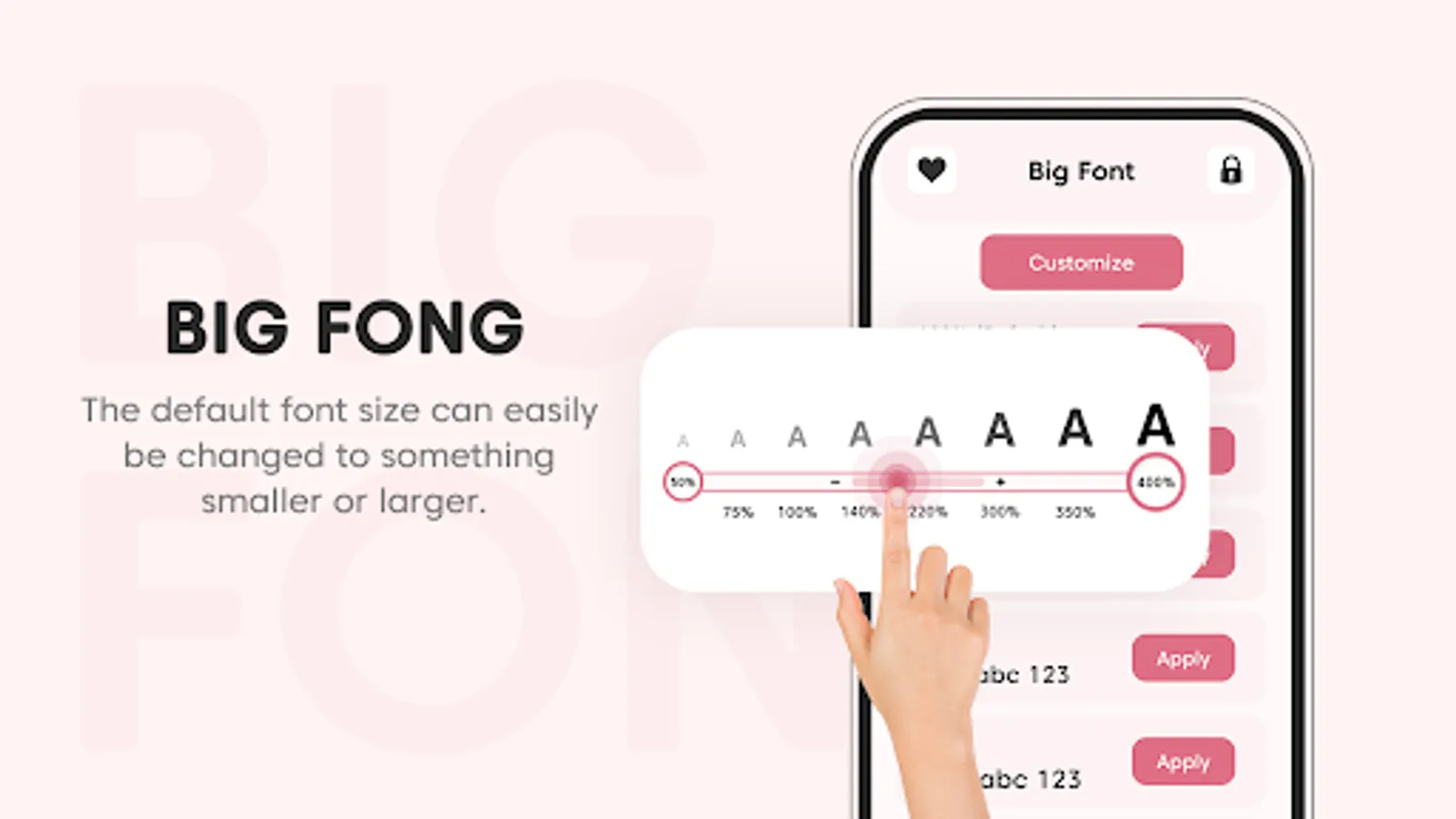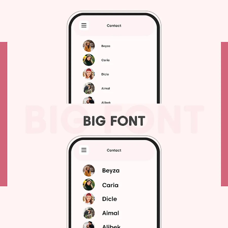 Big Font: Change Font Size The app is particularly useful for anyone who has visual impairment who have difficulty reading small text on their phone or finds the default keyboard size too small for comfortable typing. With Big Font: Change Font Size App, you can enjoy more stylish font styles and easily change them into different sizes according to your needs. Big Font: Change Font Size is a simple tool to help you change system font size and Display the exact increased percentage of font after selection. And Also you can Reset the default by just single touch. Big Font: Change Font Size you can also customize your choice of font size and change the font size with a simple click.