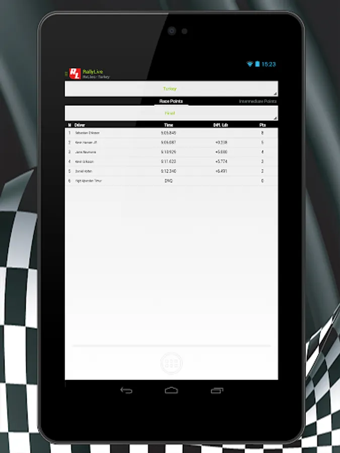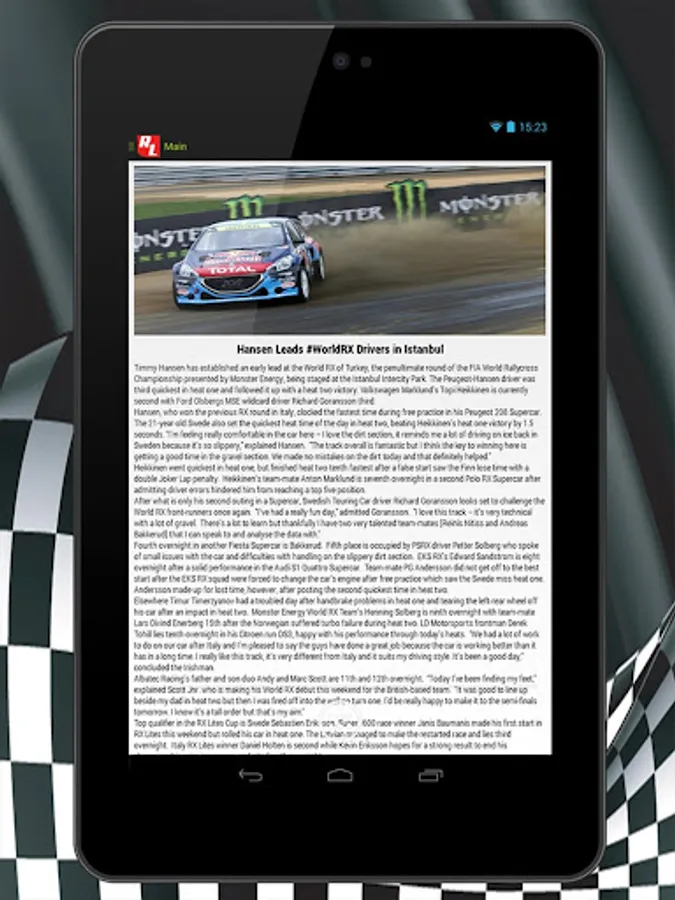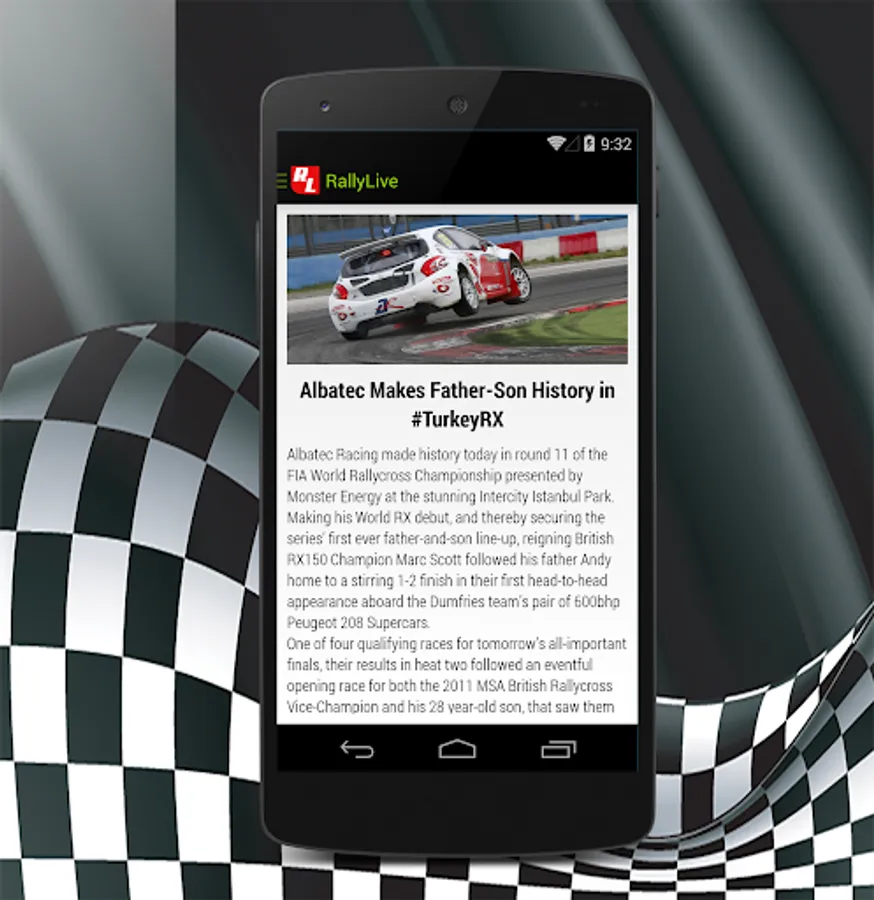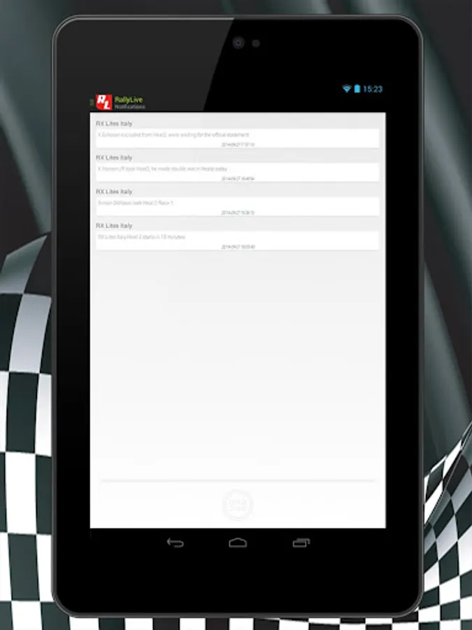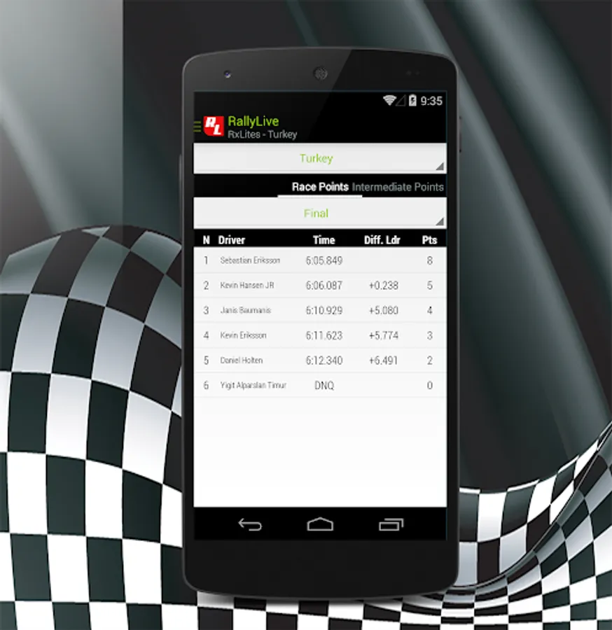 RallyLive is application that gives online results, flash news, notifications from rallies, hill-climb races and rallycross races .