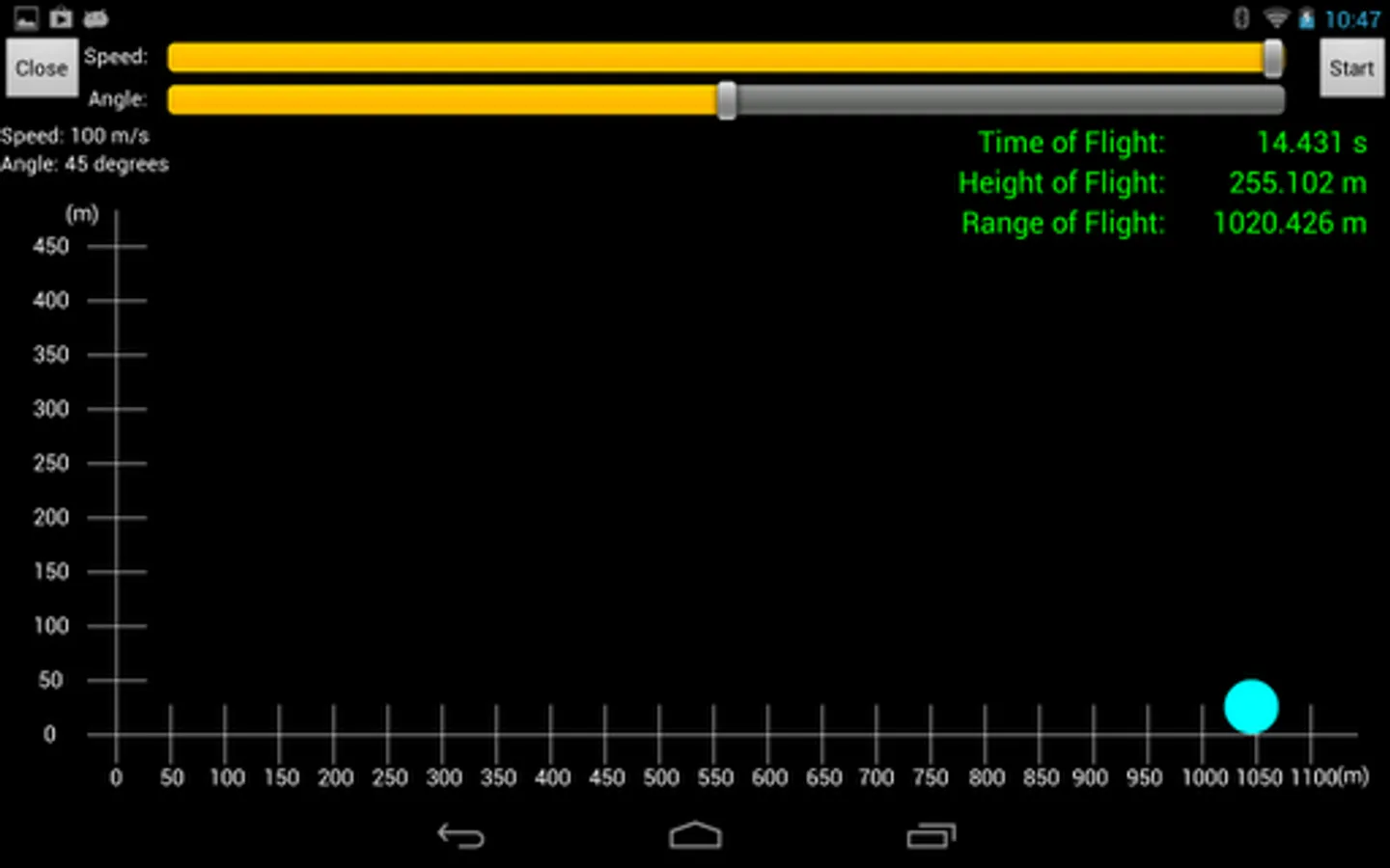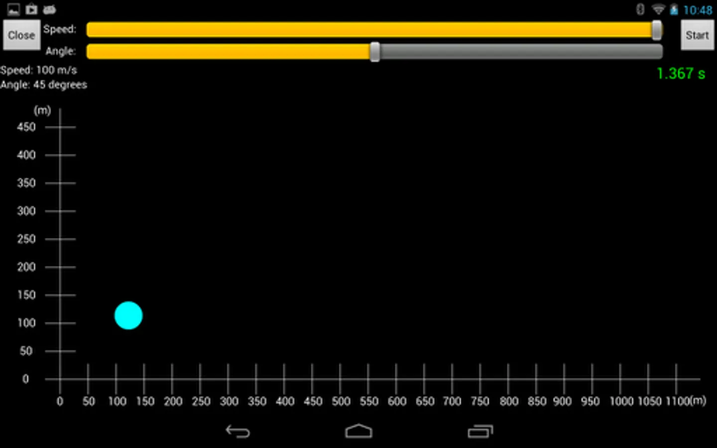 Set the speed and angle and watch the object fly in real time! At the end, see the correct range, height, and time of the flight.