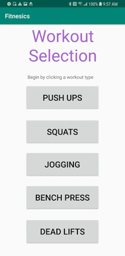 Users can select from five workout types: Pushups, Squats, Jogging, Bench press and Deadlifts.