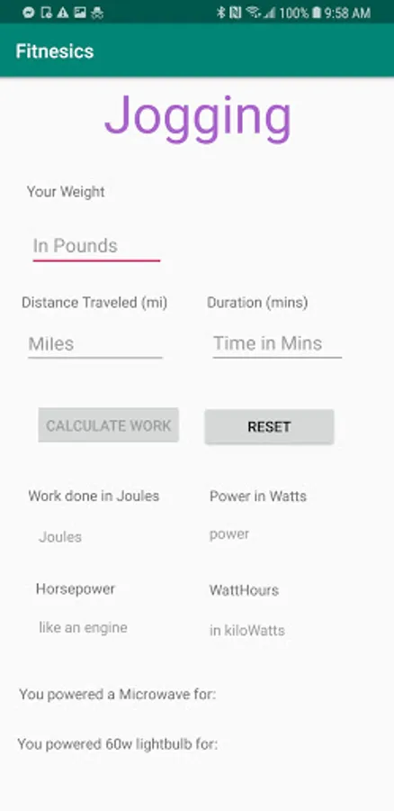 The user enters their weight, and height. Then enters their workout, and their energy output is calculated.