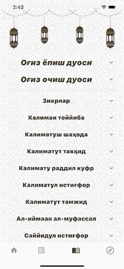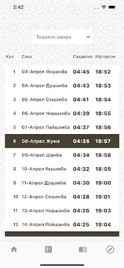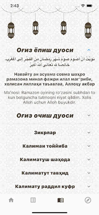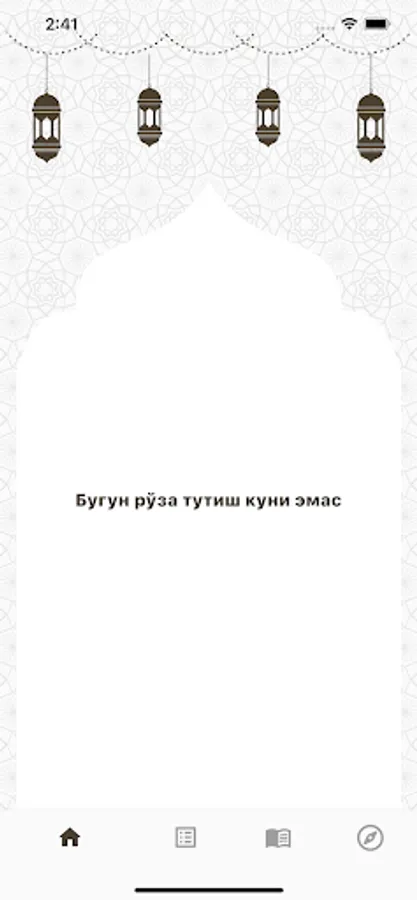Ramazon kunlari va vaqtlarini ko'rsatish va bazi duolar va qiblani topish imkoniyati bor ilova