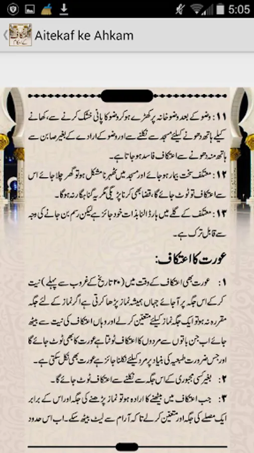 Aitekaf ke Ahkam aur unke masail ki maloomat asan urdu zuban mai tafseelan tamam musalman behan bhaion k liye. Is app mai aurton ke aitekaf se mutalalik bhi maloomat faraham ki gayi hia. Ramzan ke babarkat mahine mai roza aur ibadat ke sath sath aitekaf ke sawab aur Allah ki khushnoodi hasil kerne k liye is app mai hamare behen bhaion k liye renhnumai faraham ki gayi hai tak ke sab ziyada se ziyada sawab kama ker ramzan ki fazeelat ka poora faida utha saken.