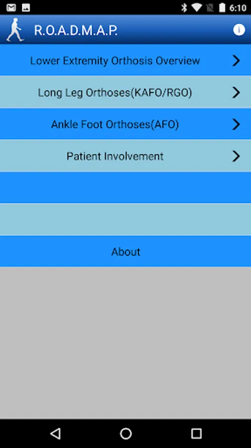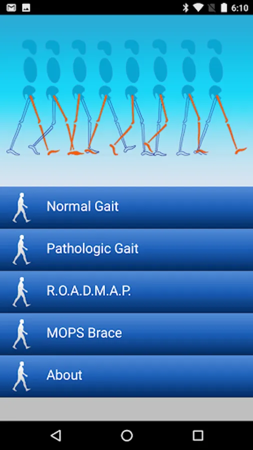 ■ User Manual - To use the RanchoGait app, the user simply taps on module menu items and the element of interest, including Gait Cycle, Phases, Functional Tasks, Critical Events, etc. An interactive player allows the user to view a video clip that describes the highlights and essential elements of the gait cycle and other sub-categories. The user can interact with the available choices for playing the phases and sub-categories of Normal Gait. In the R.O.A.D.M.A.P. module, the user interact with the available choices for identifying the most appropriate type and setting of lower extremity brace. In the Brace module, the user can interact with the available choices for selecting the proper steps for setting the highly adjustable lower extremity orthosis called MOPS Brace.