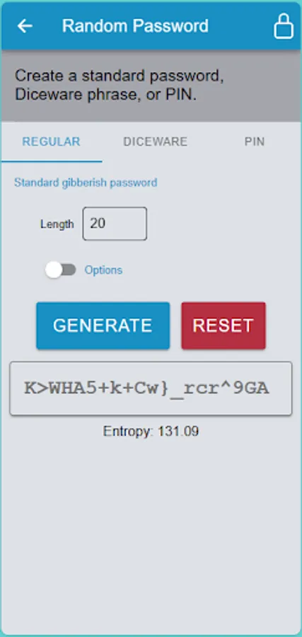 • Passwords: Random standard passwords (length 1-999), Diceware (1-99 words), or a PIN (1-99 digits). Shows the entropy of your password.