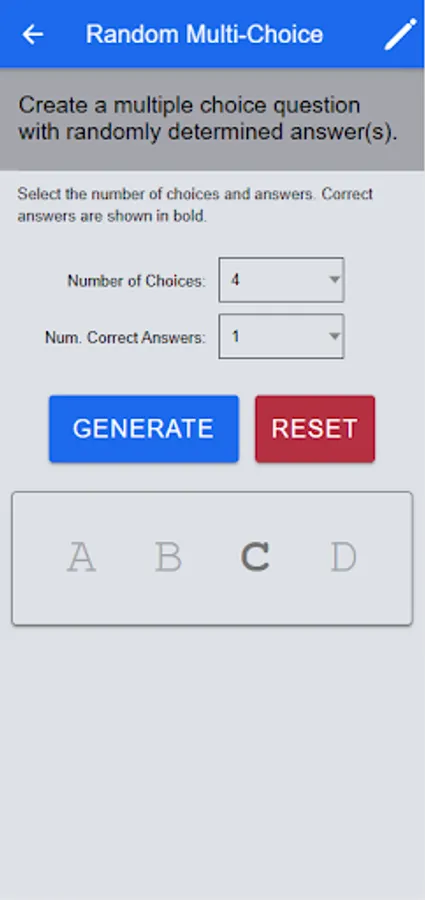 • Multiple Choice: For generating random answers for multiple choice questions.