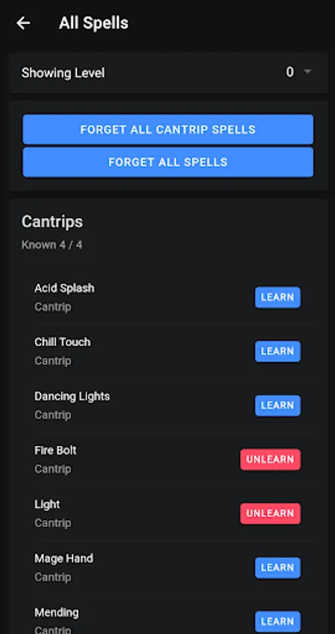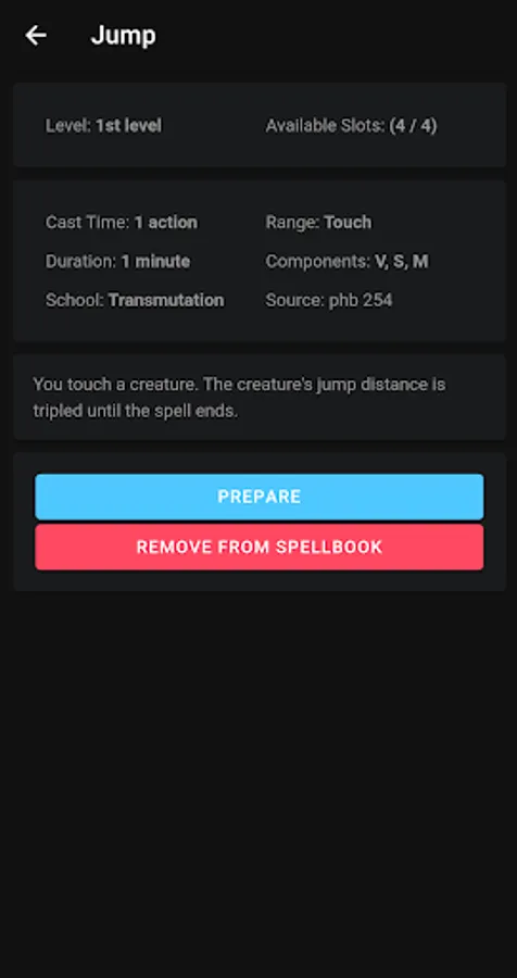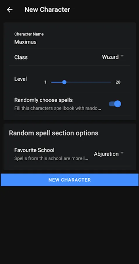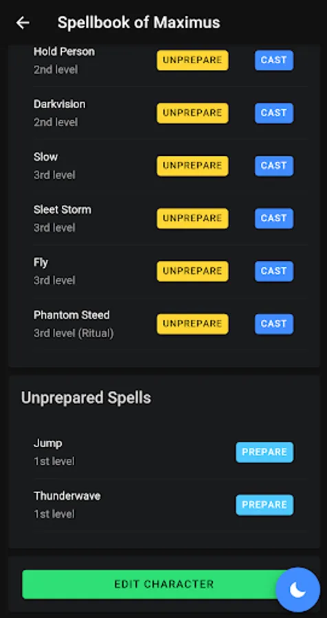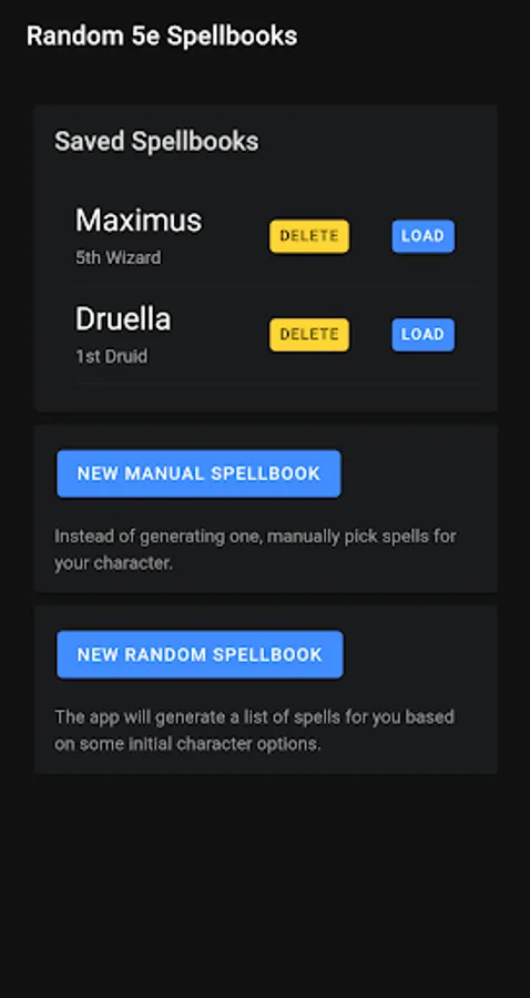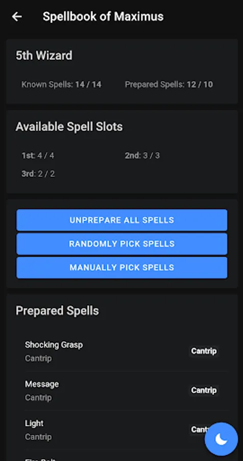 The app tracks spell slots and allows you to manually alter known spells, allowing you to use the app to play your generated spellcaster in game.