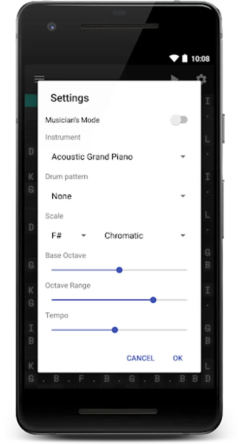 Musician's Mode can be toggled to hear which single characters are played as Major or Minor chords as well as Augmented or Diminished chords while tapping.