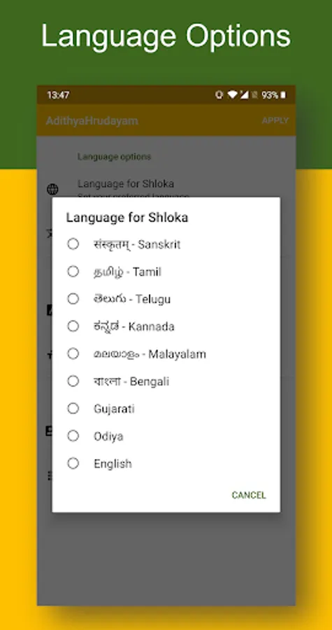 Read and listen to the powerful Aditya Hrudayam through this app. Available in 9 different Indian languages - Hindi (Sanskrit), Tamil, Telugu, Kannada, Malayalam, Bengali, Gujarati, Odiya and English. There are no annoying ads in this app.