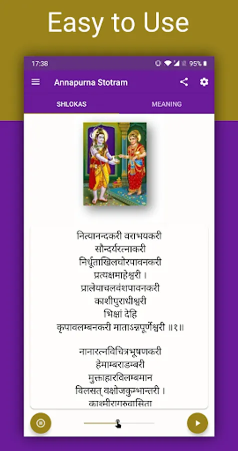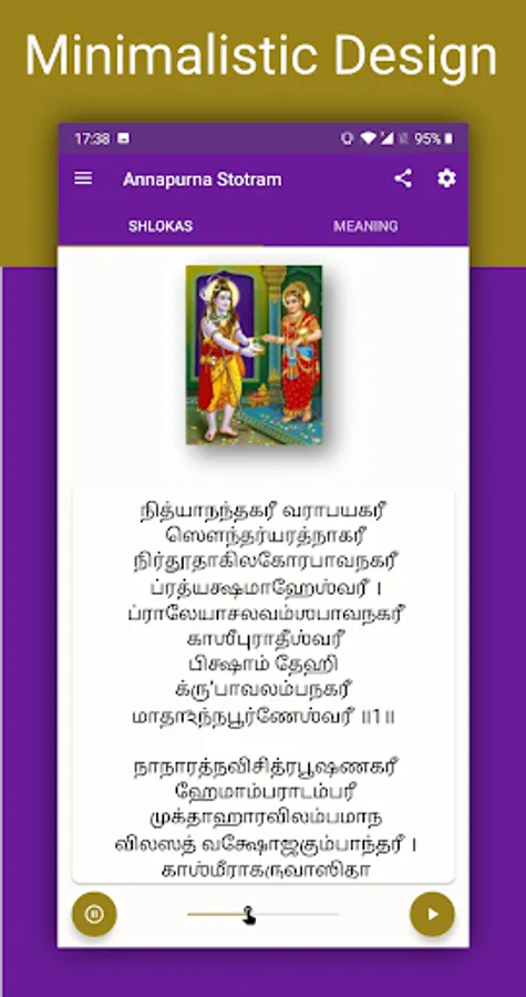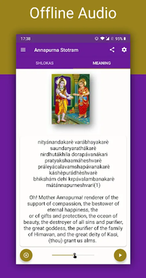 🚀 The audio of Annapurna Stotram can be paused and resumed without any glitch. And the audio can also run on the background if you want to use your phone for some other activity simultaneously.