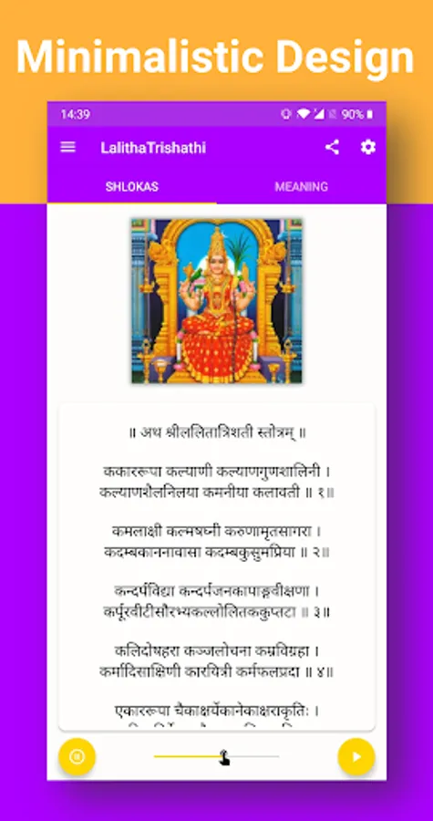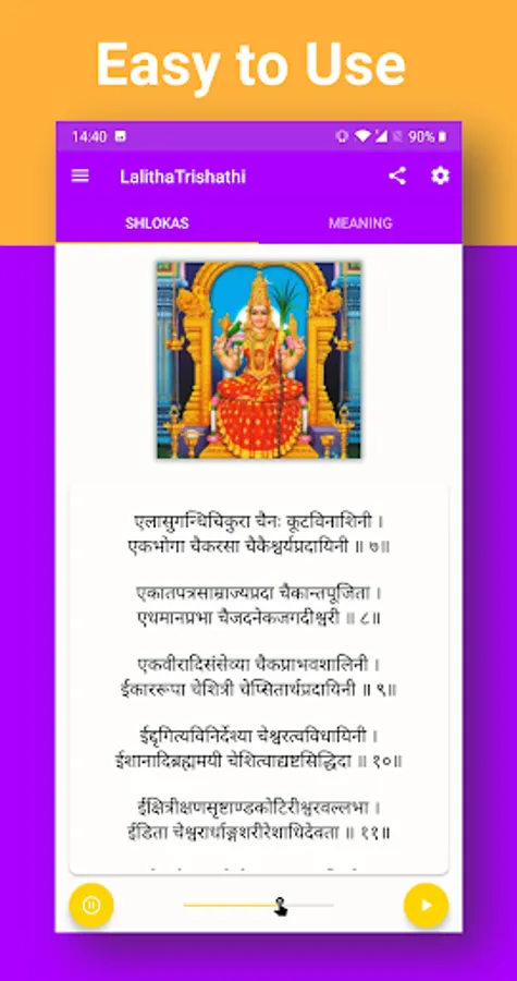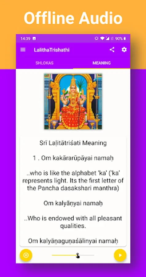 🚀 The audio of Lalitha Trishati Stotram can be paused and resumed without any glitch. And the audio can also run on the background if you want to use your phone for some other activity simultaneously.