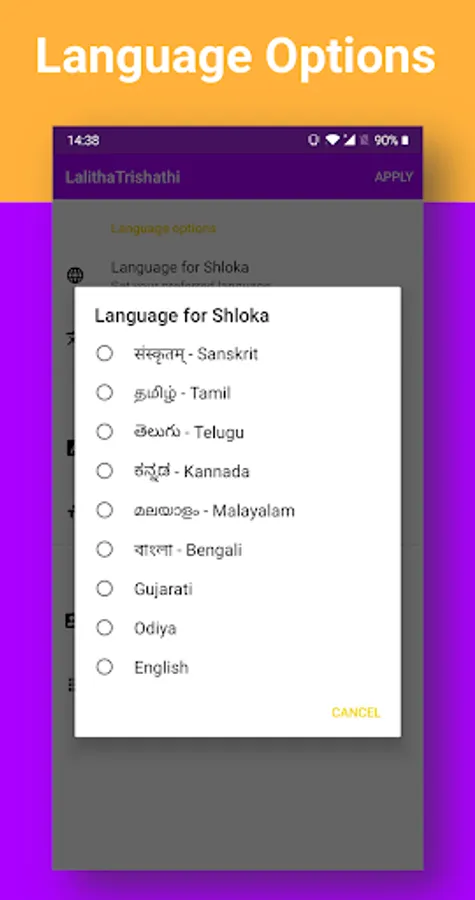 🚀 Lalitha Trishati Stotram is presented in 9 different Indian languages - Hindi (Sanskrit), Tamil, Telugu, Kannada, Malayalam, Bengali, Gujarati, Odiya and English. App will remember your preferences.