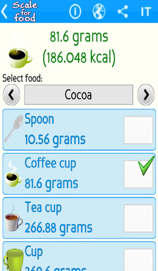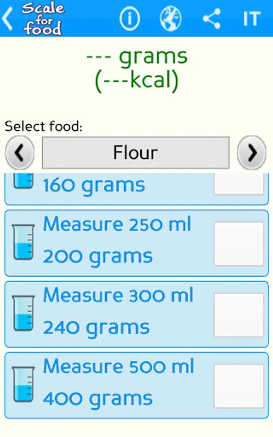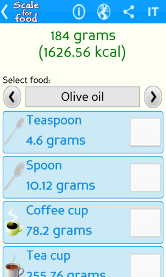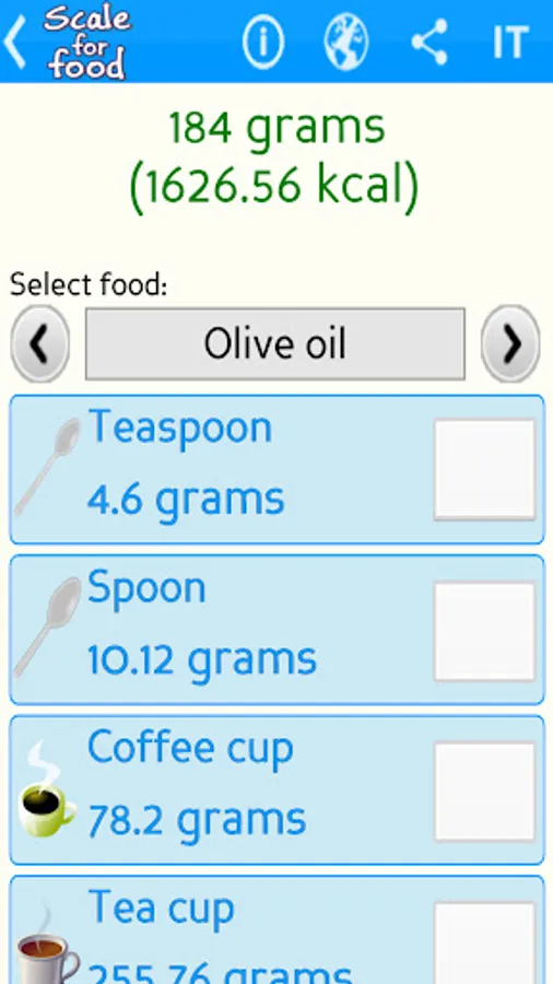 Scale for food is a practical and accurate kitchen digital scale that calculates the weight in grams of the most common foods (like milk, flour, olive oil, sugar, salt and more) for a specific container (spoon, teaspoon, glass, cup, ladle and more).