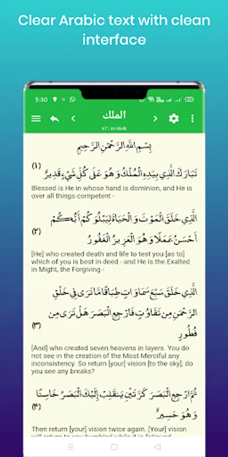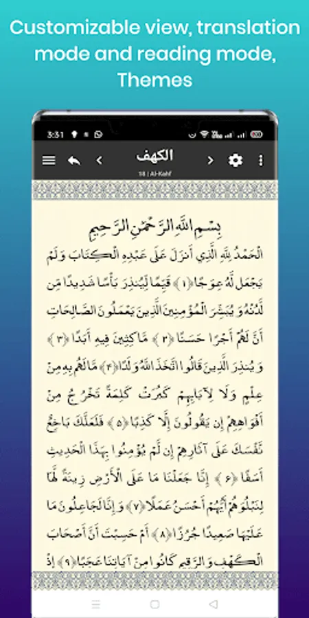 Page view : in this mode all the verses displayed one after other, Tap on the ayat to show meaning.