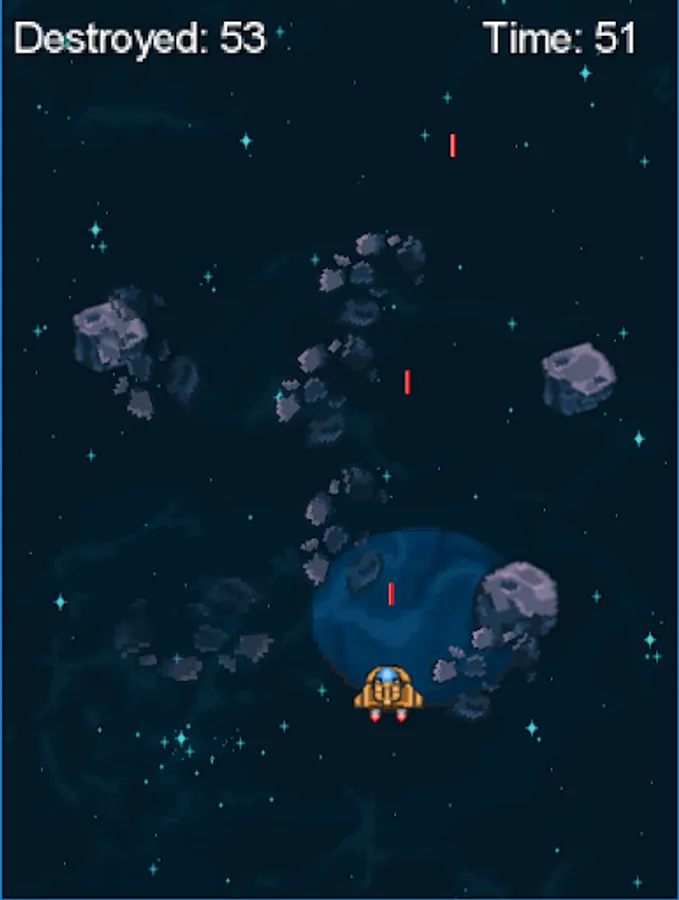 Use your spaceship to defend the planet from a barrage of meteors. Choose your spaceship from the main menu screen. Meteors will randomly spawn in gradual increments as you destroy them. If 3 meteors get past you, game over!