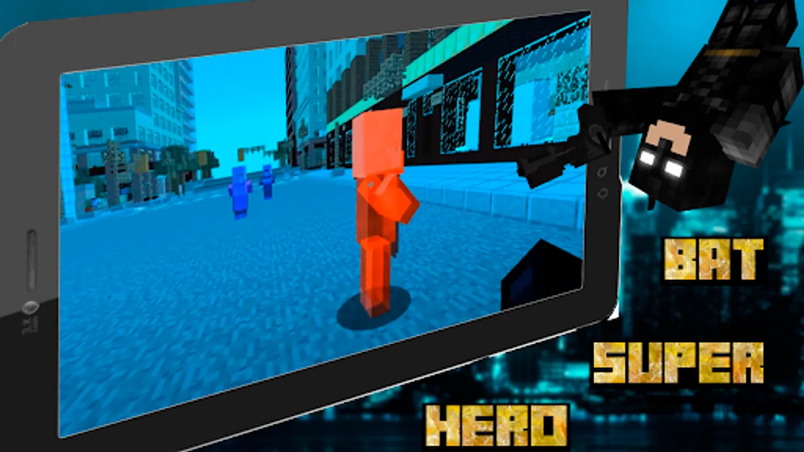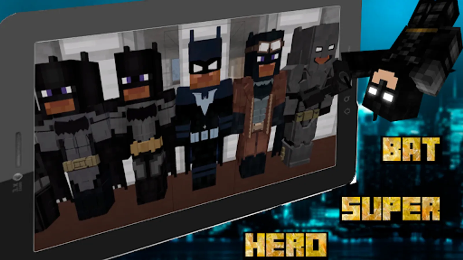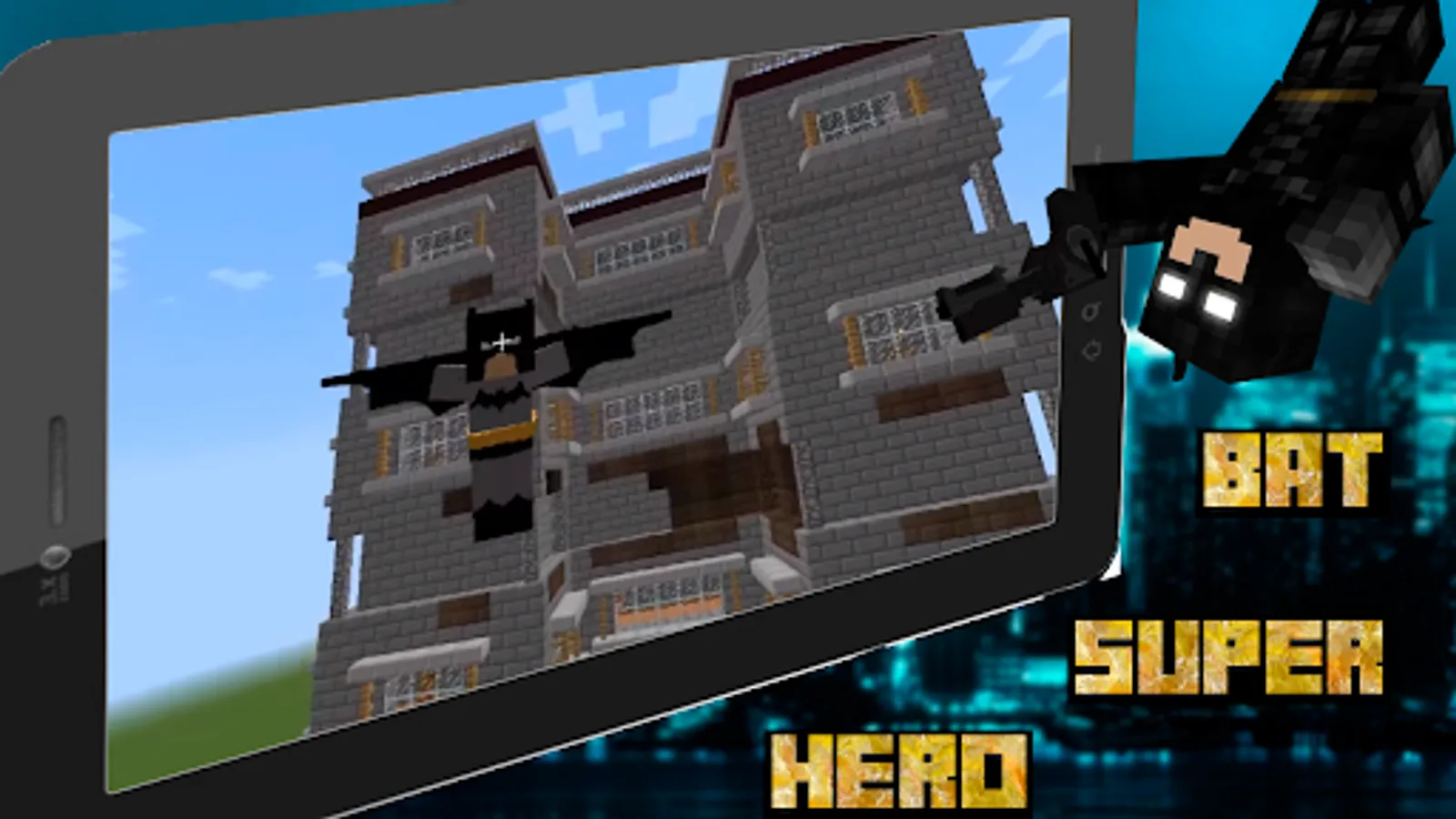 Hello friend, in Bat Superhero Mod for MCPE, you will have several skins available, these are a bat, a joker, an iron batman, a batman, a penguin skin, an arkham horror costume and of course a true friend of the superhero Robin. A huge bonus is that you don't have to be in creative mode, everything you can do in survival mode. The superhero bat and his weapon will be available after crafting on the table. There are also black elytra similar to those of Ender and the ability to fly with the cloak spread out. You will have a weapon - a hook, which will help you move quickly through skyscrapers and houses. All you need to do is fire a black web from your pistol that will stick to any surface. Almost the entire set of ninjas will be available to you - shurikens and boomerangs in the form of a bat, and wings for moving through the air, like a bird. Boomerangs are normal and with the effect of dynamite, after the explosion they will cause damage around. Electric shuriken kills all life in its path. All skins are free