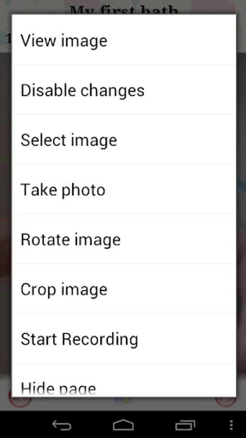 Add photo to your baby book just by simply clicking on the page, or select action via menu.