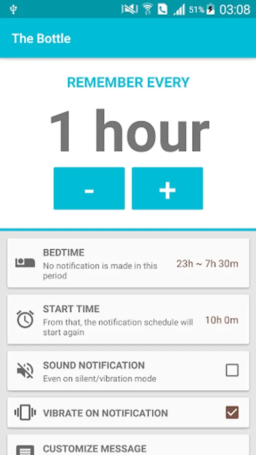 The Bottle is an app on the reminder style, you can program it to remind you of time in hours, taking water. So you stay hydrated all day.