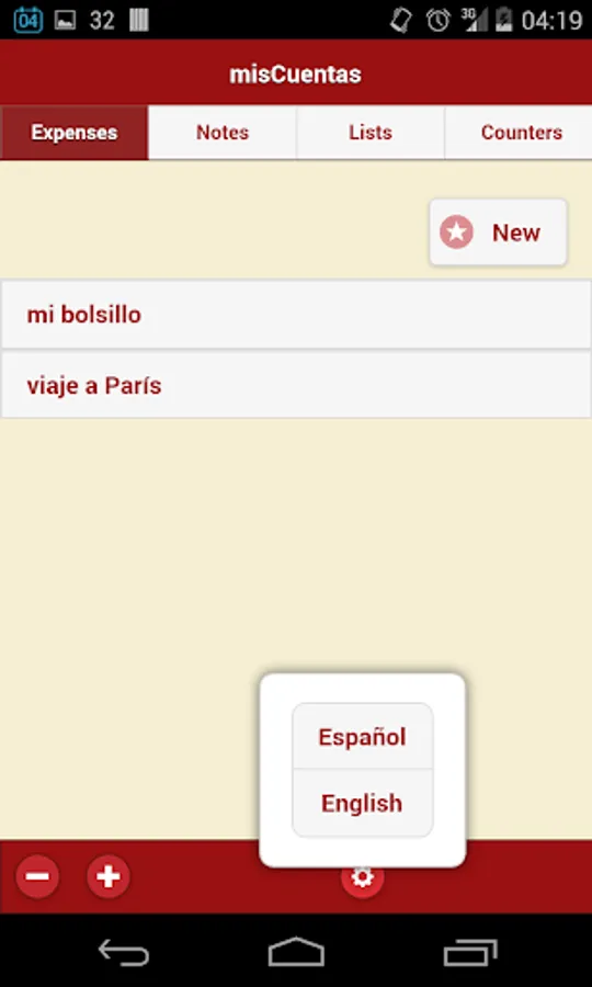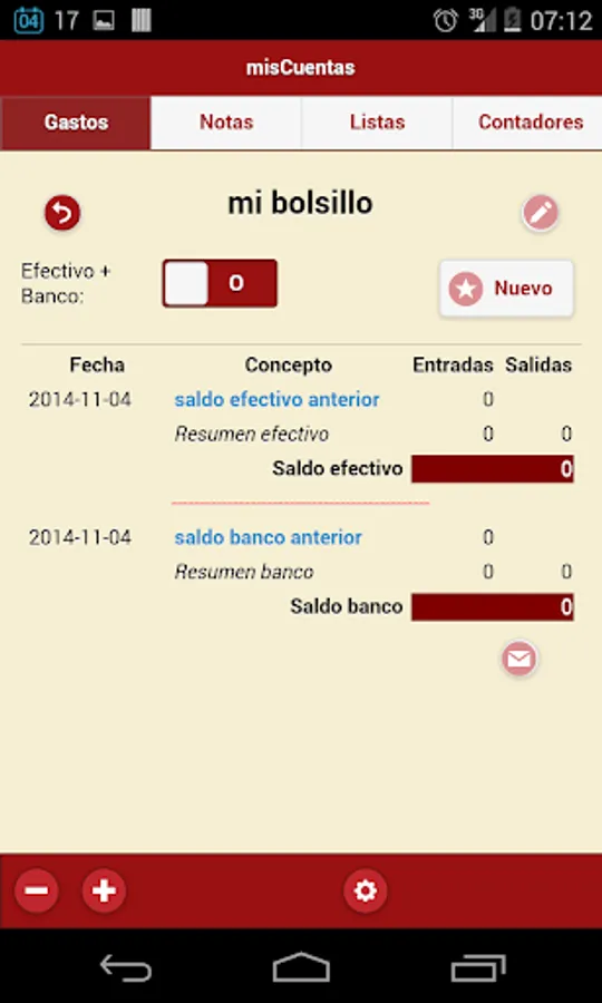 1. Take note of your ordinary expenses in a very simple way, distinguing between cash and bank. It can be created several accounts so, for example, you can have separately the expenses of a trip, or whatever.