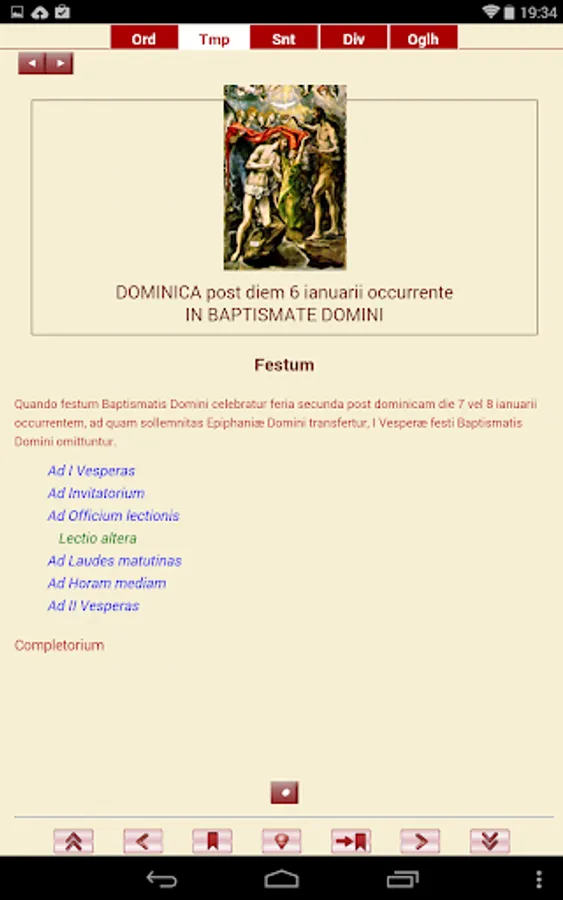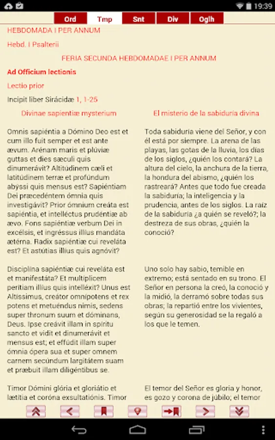 Access to the various parts of the Mass through tabs, which come to be the equivalent of a missal ribbons, remembering the previous position of each one. This allows "prepare" the Mass to be followed, without going through links during the celebration.