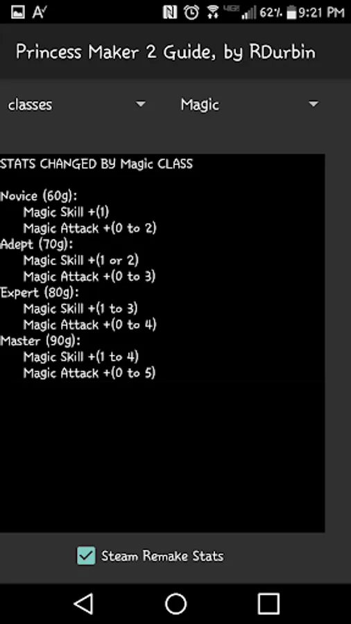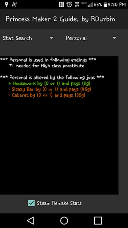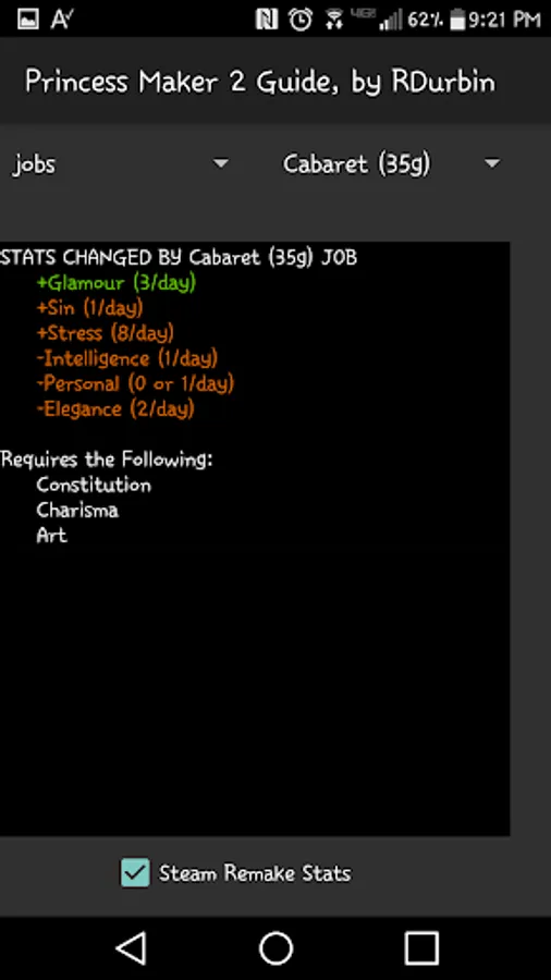 stat guide for princess maker 2. It allows you to enter a job, class to see the effects on stats that the job or class does. You can also select an ending and it will display the needed stats to achieve the ending. There is also a reverse search where you can choose a certain stat and it will list all classes or job that effect after the stat