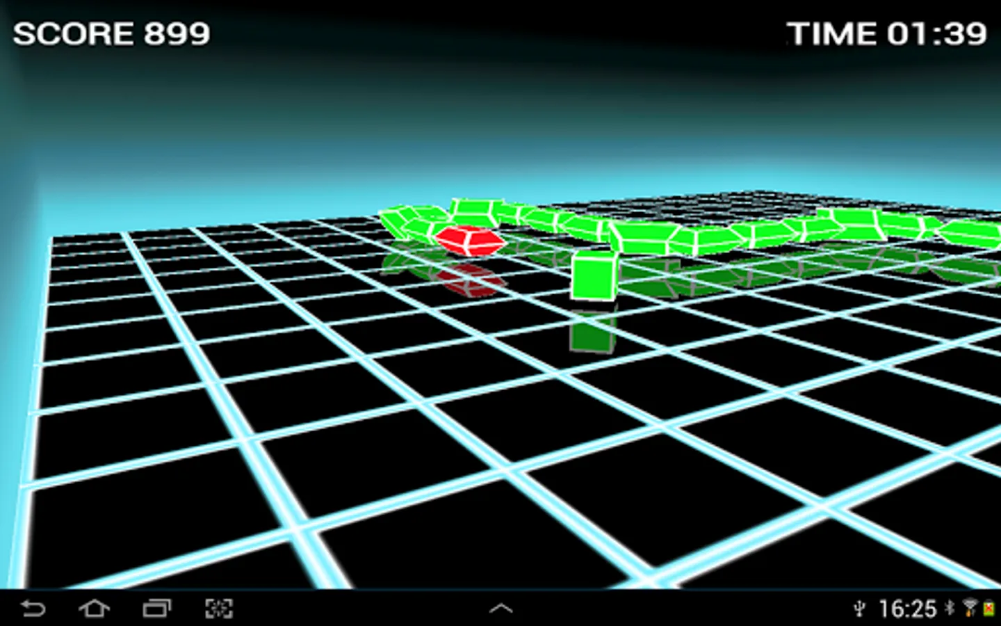 This is the classic snake game revisited in 3D. The snake eats thre frog (green cube) and grow. He dies if it touches a wall or his own body.