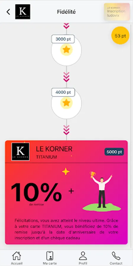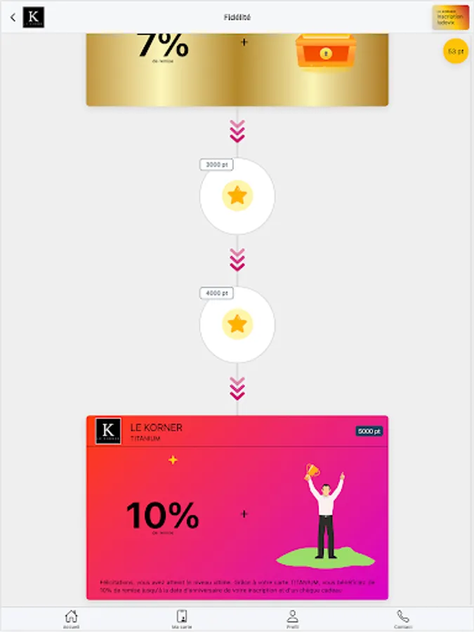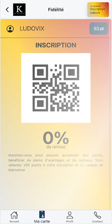Upon registration, the Korner offers you 40 loyalty points (equivalent to 40 euros) + a welcome gift and at each checkout, the amount of your receipt will be converted into a loyalty point on presentation of the QRCode of the application. The accumulation of these points entitles you to gifts and exceptional discounts.