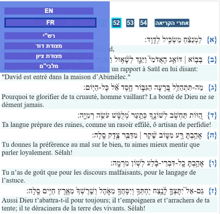 Read (and understand!) The Psalms with English and French translation and the commentaries: Rashi, Malbim, Citadel of David, Citadel of Zion