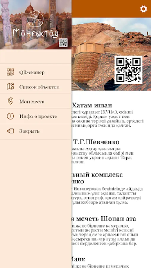 This application is designed for the purpose of digitization of Sacred Places of Mangistau region. Under the sacred object refers particularly venerated monuments of the natural landscape and cultural heritage, secular and religious architecture, mausoleums, as well as places associated with historical and political events that have lasting value in the people's memory.