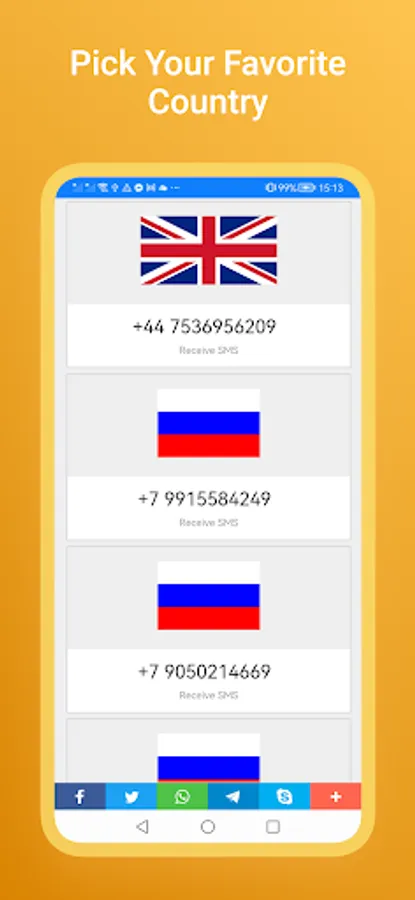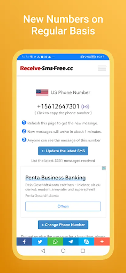 RECEIVE-SMS IS A FREE SERVICE FOR RECEIVING SMS MESSAGES AND VOICE MAILS ONLINE. THERE IS NO NEED TO REGISTER. JUST SELECT YOUR PHONE NUMBER FROM THE LIST BELOW. YOU CAN USE IT TO RECEIVE MESSAGES FROM FACEBOOK, TELEGRAM, WECHAT, VK, PAYPAL, ALIPAY AND MORE