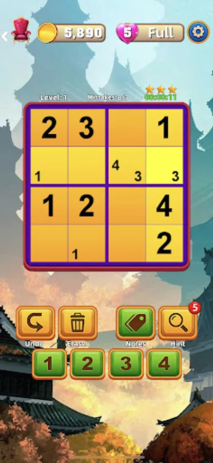 There are easy levels of daily Sudoku puzzles to train your brain and Medium or hard Sudoku levels are also waiting for you. The game has the functions that to add or remove notes by turning on the memo during gameplay. Did you make a mistake? Of course, there are undo and hints functions! Don't give up!