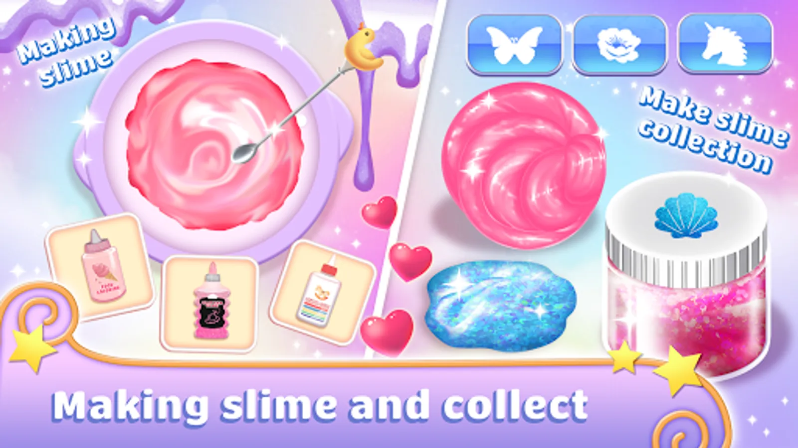 There are many fantastic features which you'll love: dress up princess Emma, spin wheel to receive special daily reward, play with slime simulator: stretching & poking, decorate a slime container and slime contest. We suggest you start with unicorn slime, galaxy slime and mermaid slime. You'll super excited and love them!