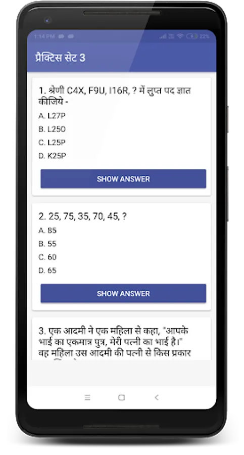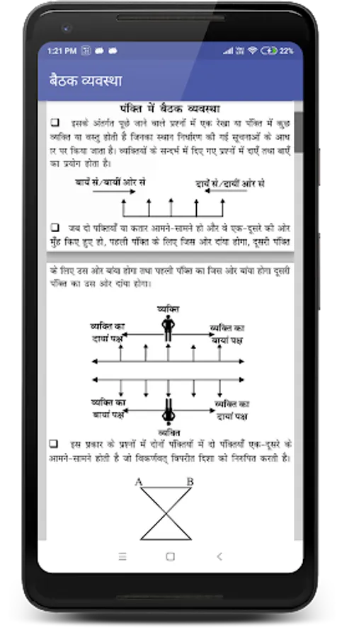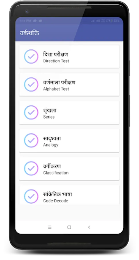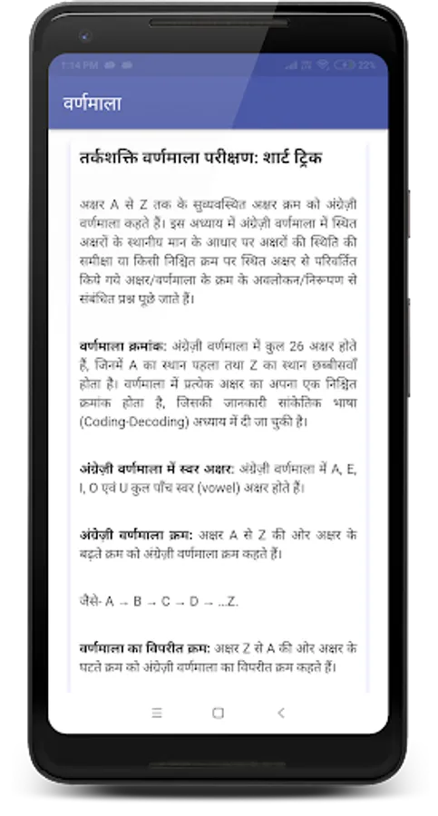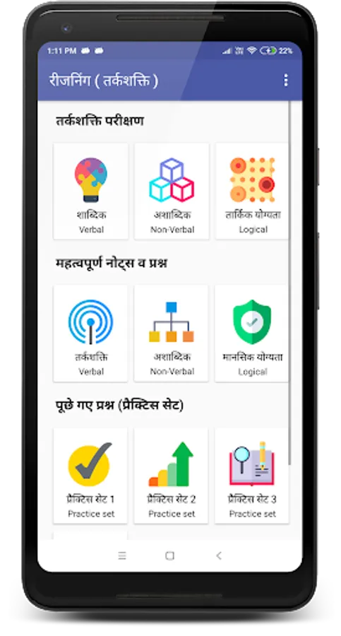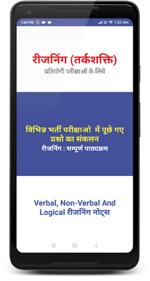 This app is made for students who are preparing for competitive exams in hindi and want to learn reasoning. This app has two parts verbal and non verbal each part again this part are divided in to part quiz and practice in hindi. Practice unlimited question and test your skill by quiz.Get Explanation of each question.