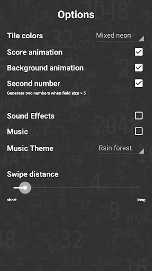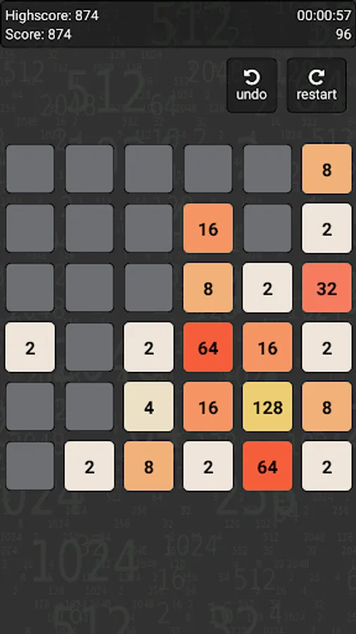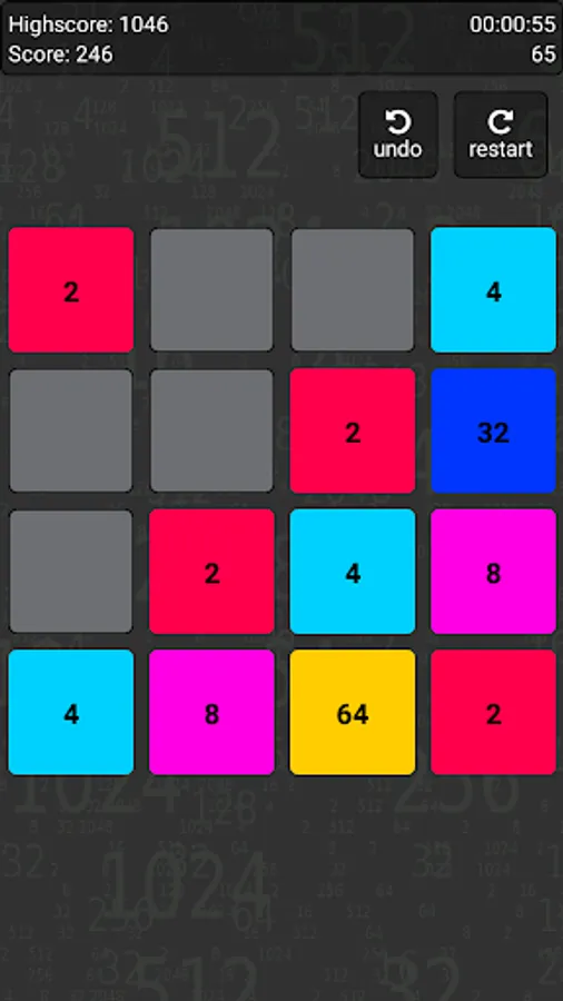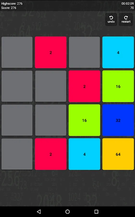 Swipe on the screen to move the tiles in the same direction. After every swipe will be a new tile created. If two tiles with the same value collide, they join up and the values get summed up. Think twice before you swipe, if the field is full and no new tile can be created the game is over.