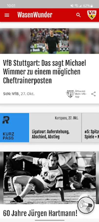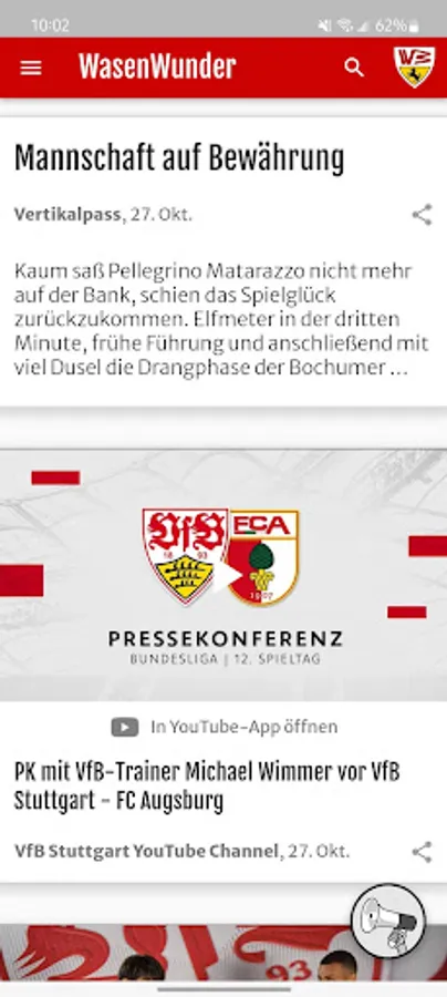 WasenWunder is a feed reader. That means: WasenWunder reads news feeds, podcast feeds, YouTube channels; By default, this happens with feeds about VfB Stuttgart, football and sports from the Stuttgart region. Their contents are then displayed. WasenWunder is not responsible for the content. Feeds can be added or switched off - as you wish.