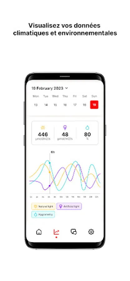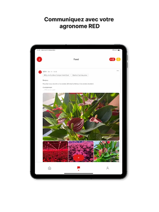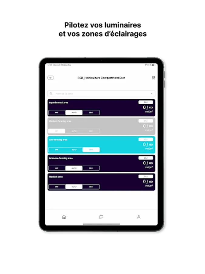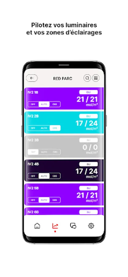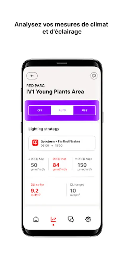 This platform dedicated to the light parameter allows you to visualise the consumption data, DLI, manage your lighting zones, activate the "Observation Mode" and even exchange with a RED agronomist.