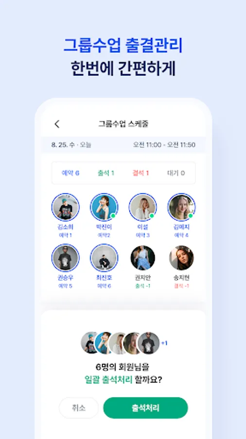- Through the batch attendance processing function, you can efficiently manage the attendance of a group class with a large number of people.