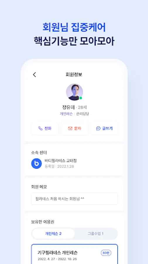 * Member management: From stable member management functions such as member registration, receivables management, expired member management, and automatic SMS transmission, instructors and staff can easily manage reservation schedules and members at any time through the coach-only mobile APP.
