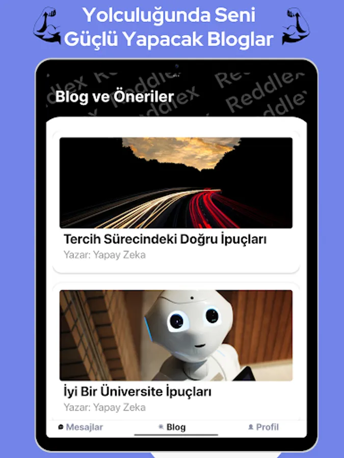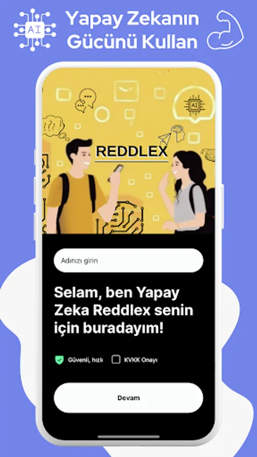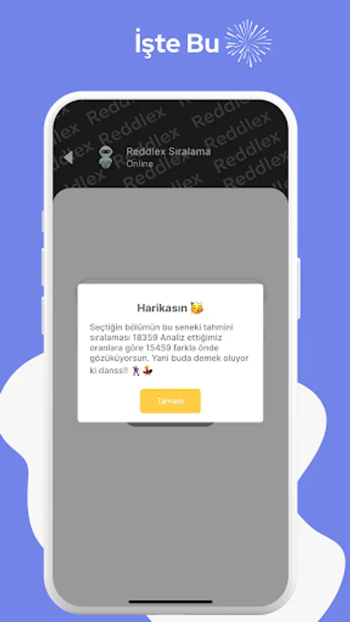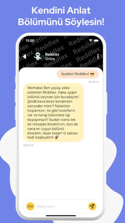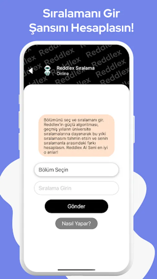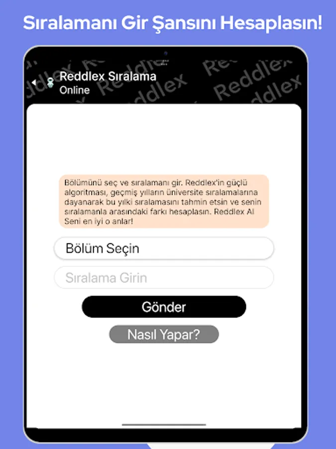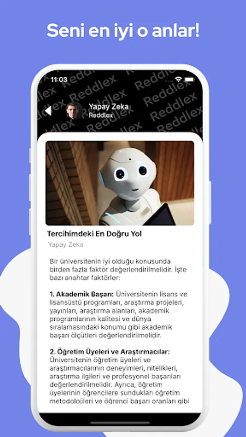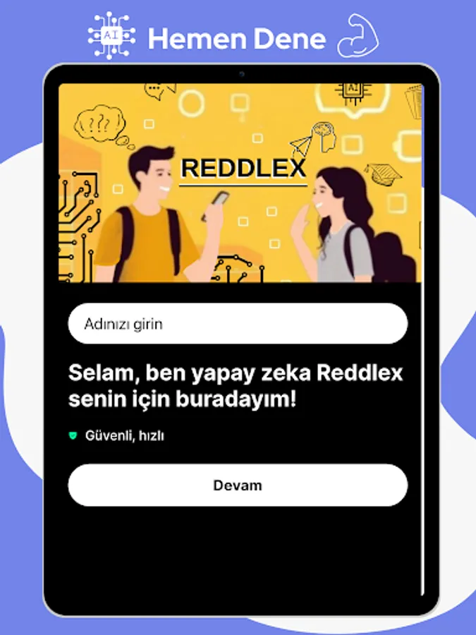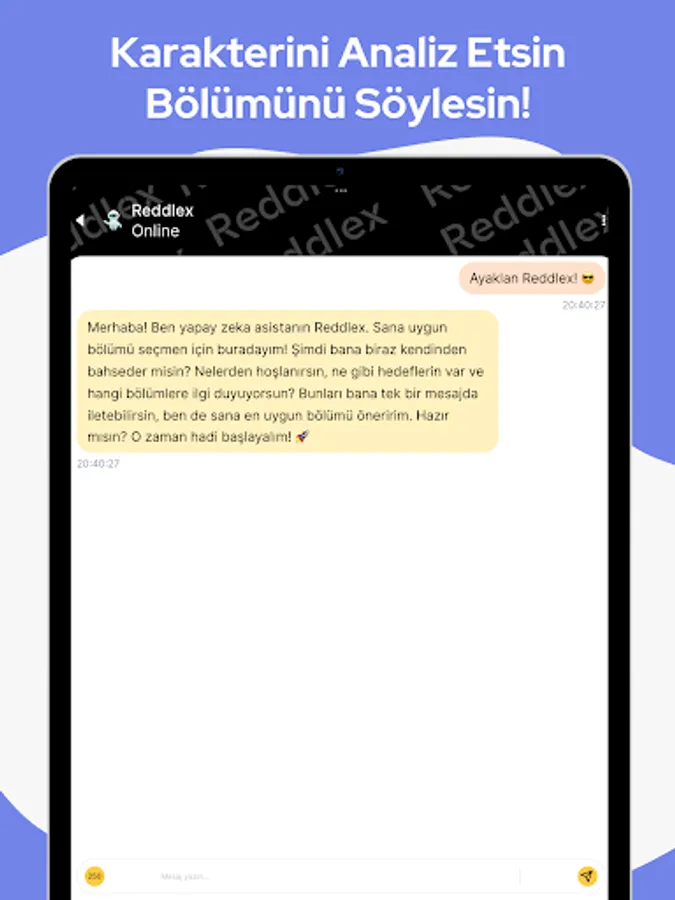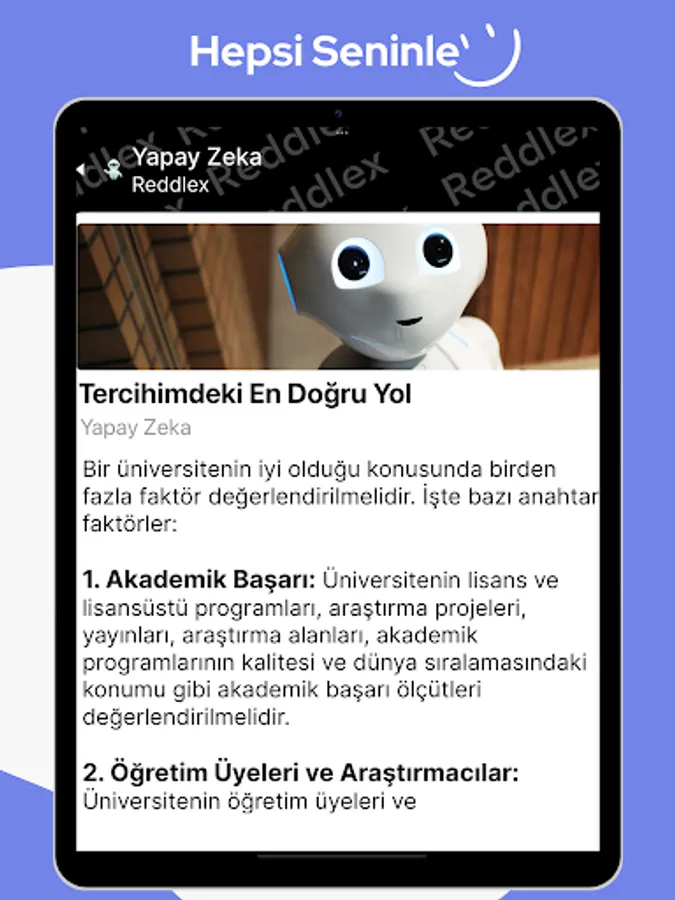 "Are you having trouble choosing a university? Determining your future can be a complex and difficult process. This is where we come in. With our application called 'Reddlex', we help you find the most suitable university department for you in line with your personal goals and wishes, using artificial intelligence. Tell me, he'll recommend the most suitable university course for you. We're here to help you shape your future."