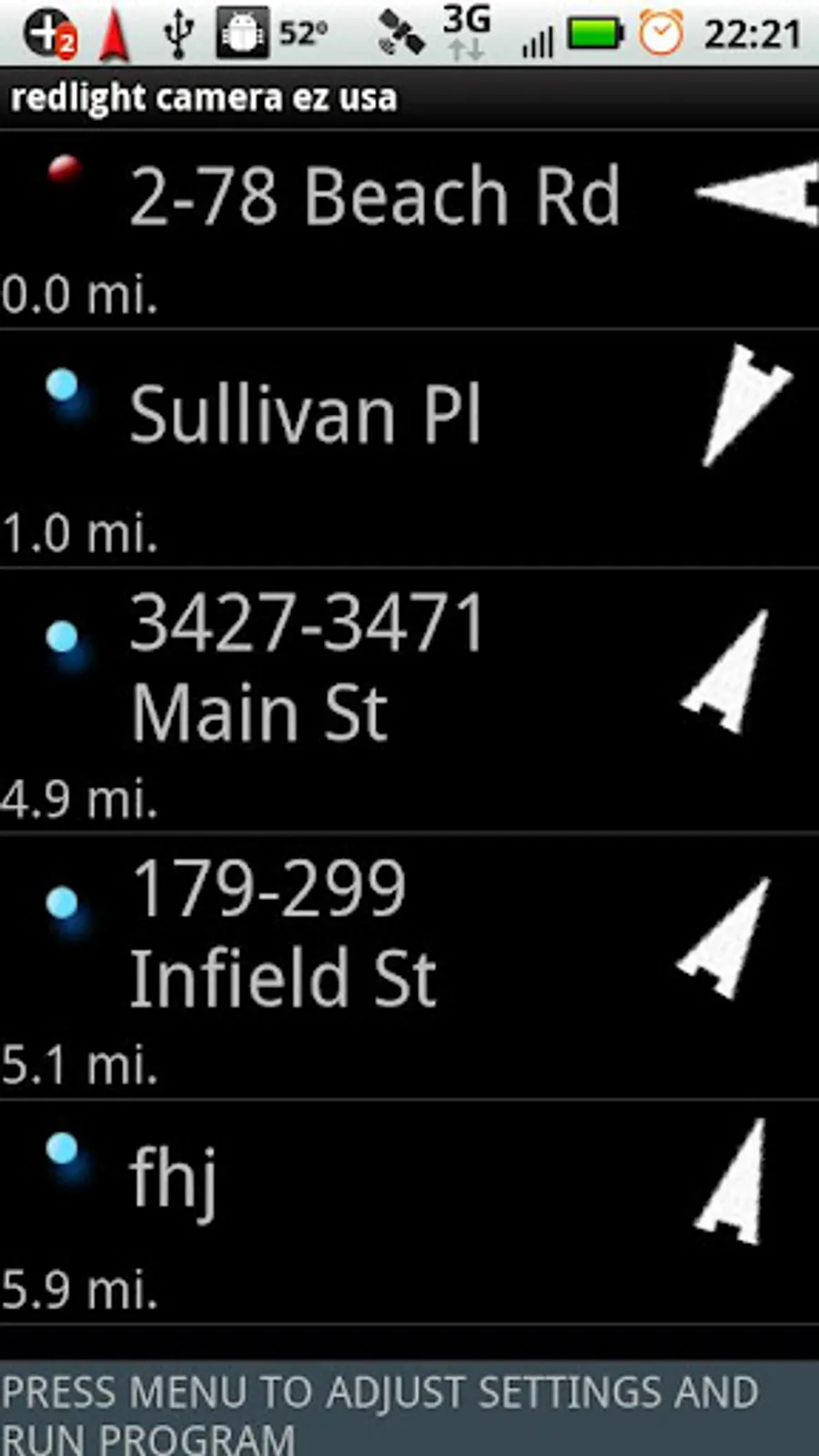 This dynamic application warns drivers of redlight cameras on route. The application lists all cameras within a 30 mile radius at any given point. Approaching a camera within 1200 feet activates an alarm which warns users that a redlight camera is ahead. The type of alarm can be selected by the user and includes LED, vibrate, ring tone or speech announcement stating the distance to the camera, or any combination of the above. The notification bar also displays a red arrowhead pointing to the nearest camera, and states the distance.