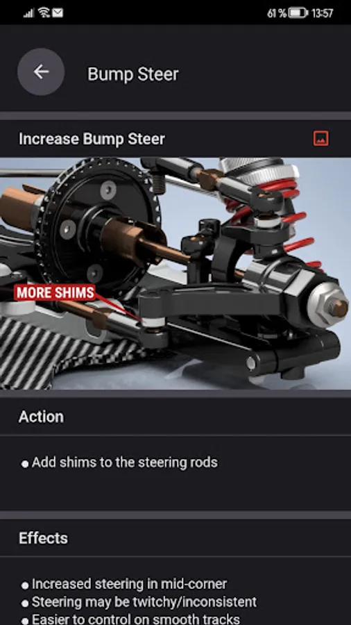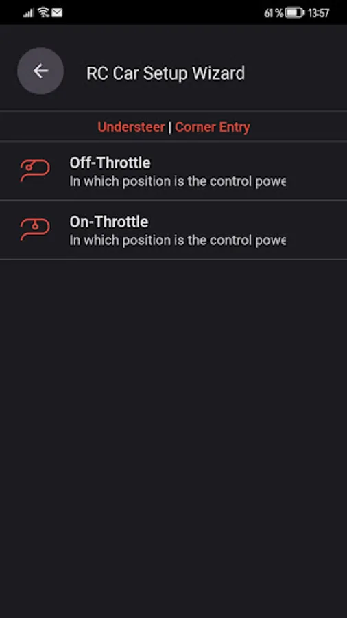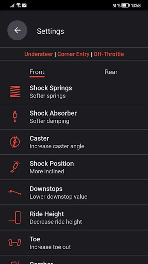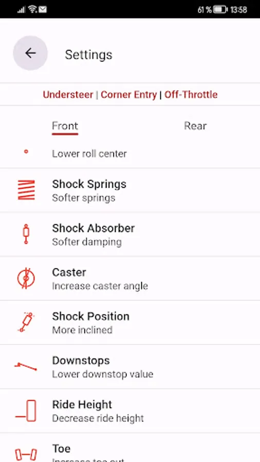 - App takes you through the analysis of the driving characteristics of the vehicle to setup the various parts.