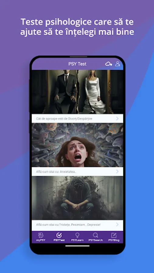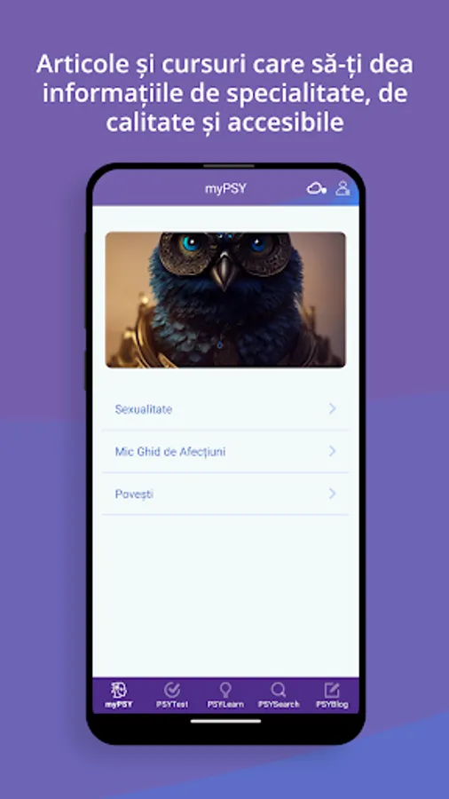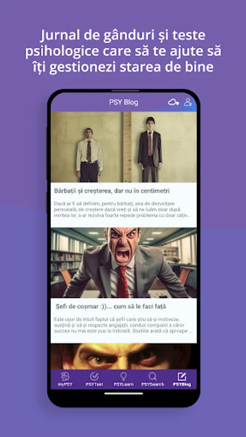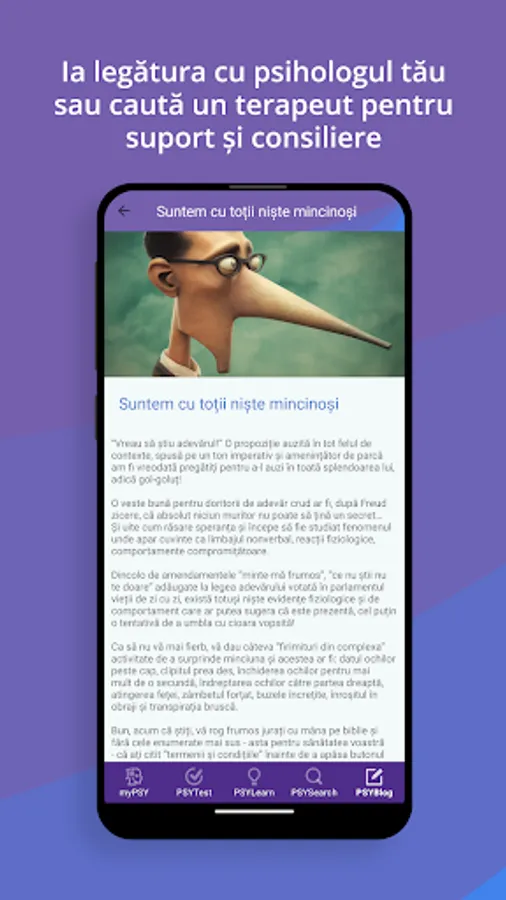 Aplicație dedicată PSIHOLOGIEI destinată atât publicului larg, companiilor cât și specialiștilor, care cuprinde informații de bază despre aproape toate afecțiunile de natură psihologică. În plus, aplicația oferă posibilitatea de a contacta psihologi, de a te programa, de a citi minime informații despre ei si despre locul unde profesează, de a pune întrebări și de a primi un răspuns la întrebările tale. Este locul unde vei primi direct articole de specialitate, informații media: video-audio, website-uri de specialitate și cursuri la care să participi.