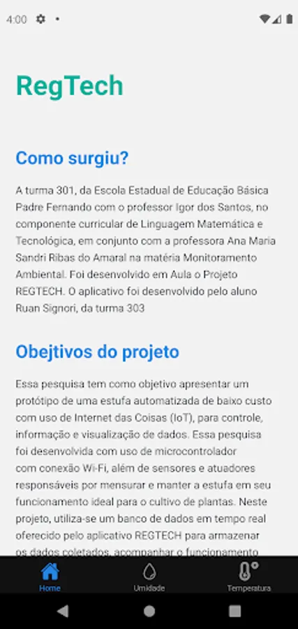 It was developed in the Mathematics and Technological Language curricular component with the help of Professor Igor do Santos, and in the Environmental Monitoring subject with the help of Professor Ana Maria Sandri Ribas. from Amaral.