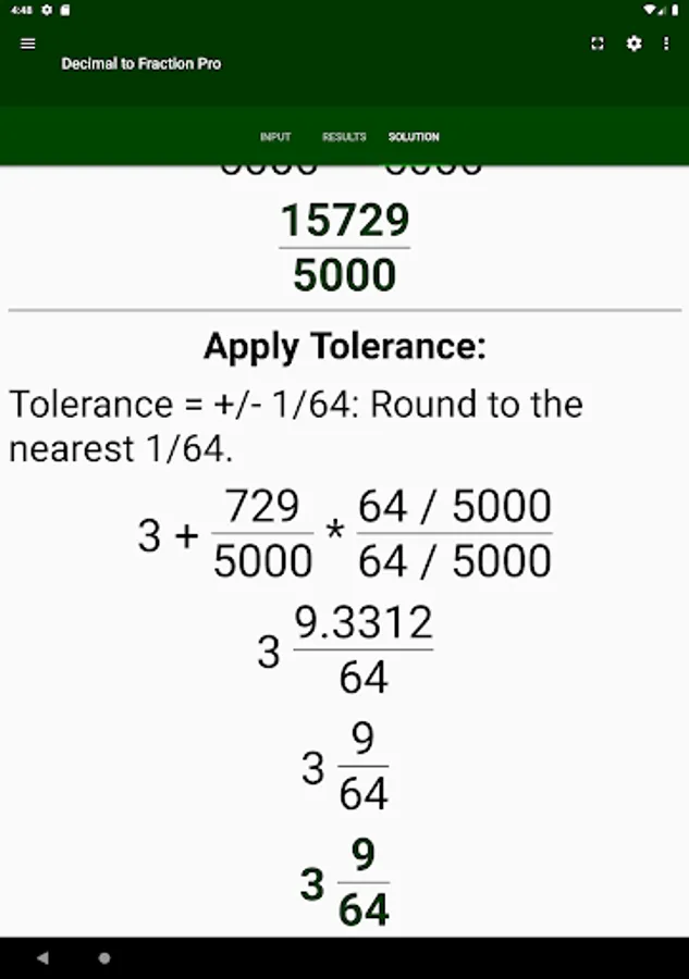 Convert between decimals and fractions, and evaluate mathematical expressions. Calculate the absolute value or round the answer to a selected tolerance value. The tolerance feature is useful for design and fabrication to quickly determine the closest fractional inch to a decimal value, either rounded up, down, or to the closest fraction.